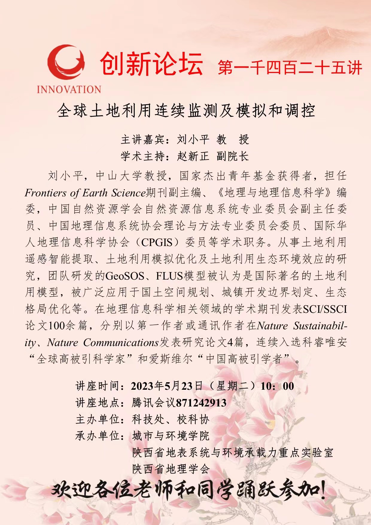 刘小平 教授 欧冠官方网站创新论坛第一千四百二十五讲:全球土地利用连续监测及模拟和调控优化 讲座时间 2023年5月23日(星期二)10:00 讲座地点 腾讯会议871242913 讲座人介绍 刘小平 教授 讲座内容