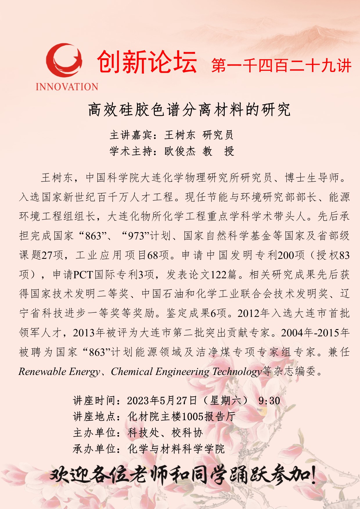 王树东 研究员 欧冠官方网站创新论坛第一千四百二十九讲:高效硅胶色谱分离材料的研究 讲座时间 2023年5月27日(星期六) 9:30 讲座地点 化材院主楼1005报告厅 讲座人介绍 王树东 研究员 讲座内容