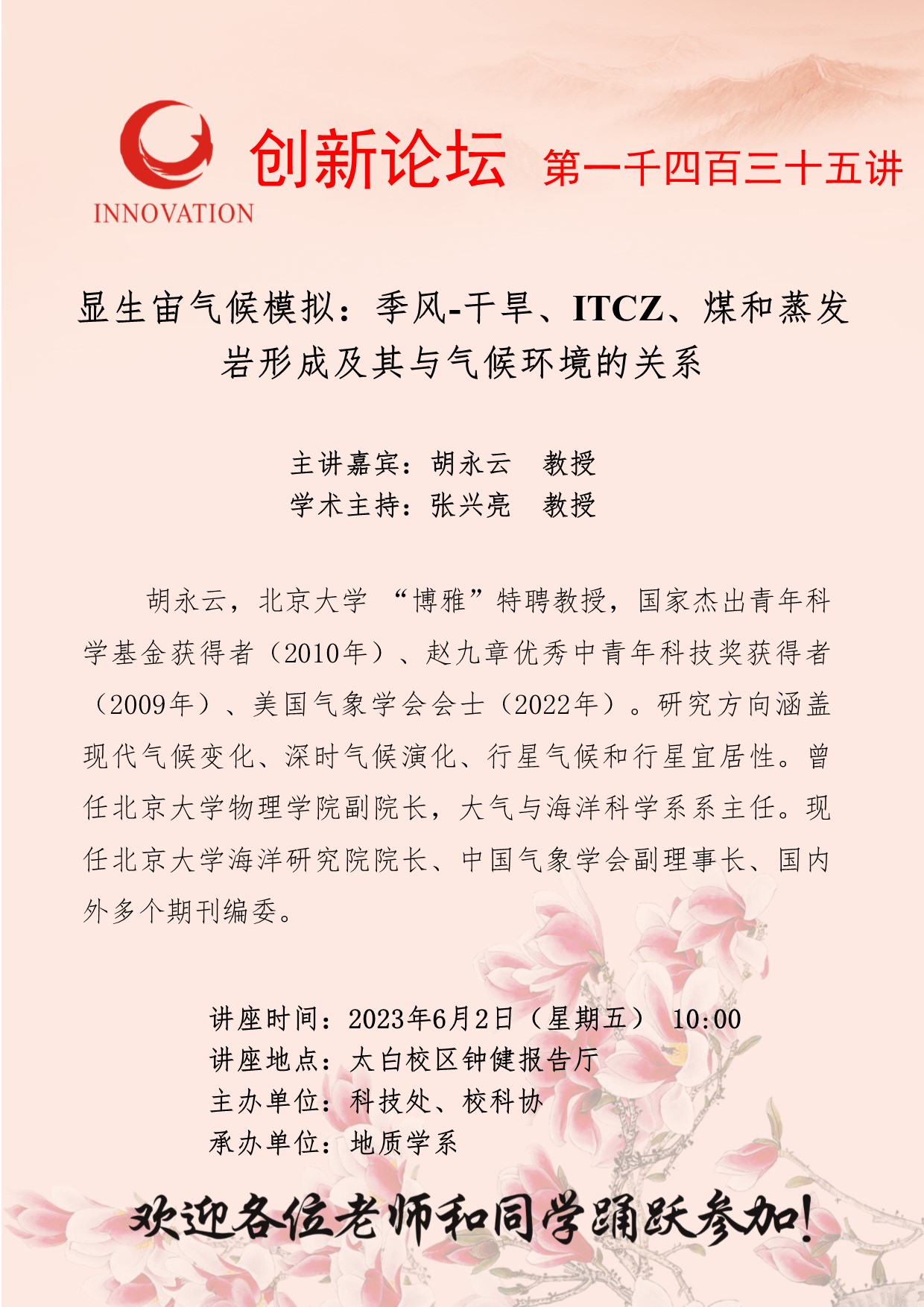 胡永云 教授 欧冠官方网站创新论坛第一千四百三十五讲:显生宙气候模拟:季风-干旱、ITCZ、煤和蒸发岩形成及其与气候环境的关系 讲座时间 2023年6月2日(星期五) 10:00 讲座地点 太白校区钟健报告厅 讲座人介绍 胡永云 教授 讲座内容