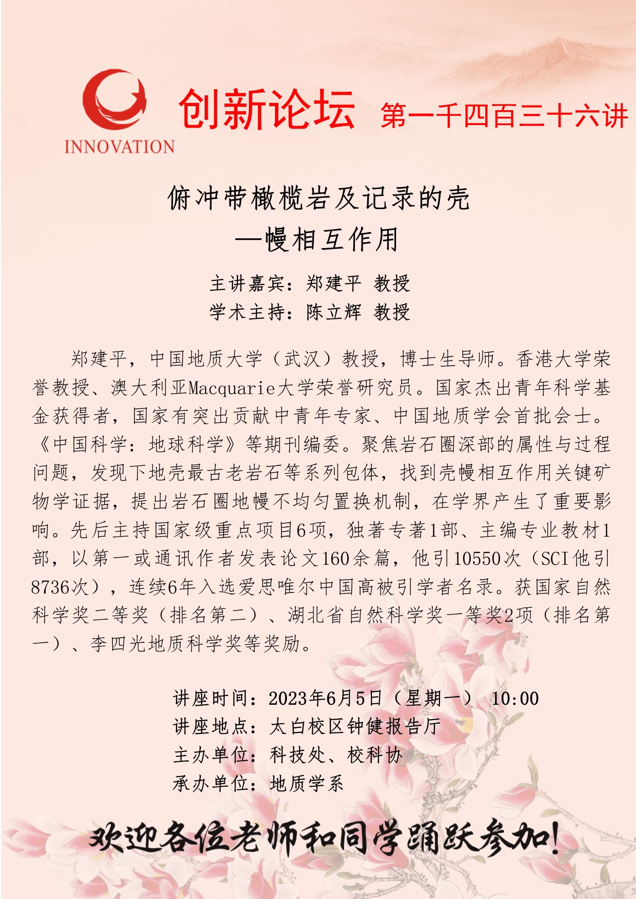 郑建平 教授 欧冠官方网站创新论坛第一千四百三十六讲:俯冲带橄榄岩及记录的壳—幔相互作用 讲座时间 2023年6月5日(星期一) 10:00 讲座地点 太白校区钟健报告厅 讲座人介绍 郑建平 教授 讲座内容