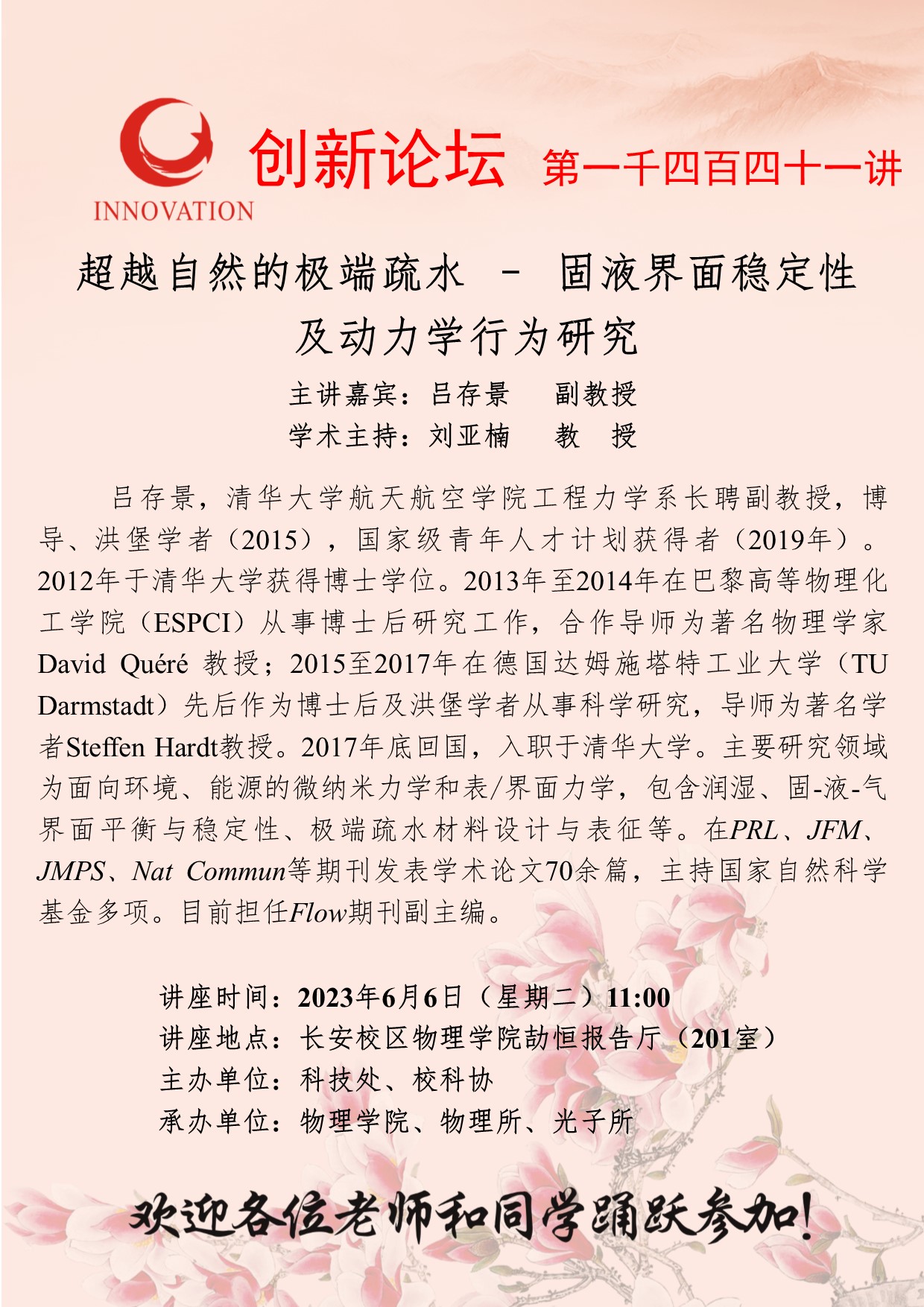吕存景 副教授 欧冠官方网站创新论坛第一千四百四十一讲:超越自然的极端疏水 – 固液界面稳定性及动力学行为研究 讲座时间 2023年6月6日(星期二)11:00 讲座地点 长安校区物理学院劼恒报告厅(201室) 讲座人介绍 吕存景 副教授 讲座内容
