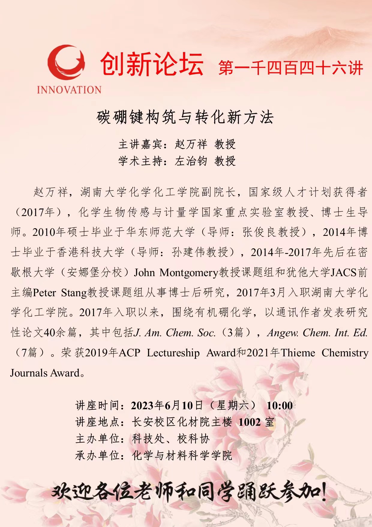 赵万祥 教授 欧冠官方网站创新论坛第一千四百四十六讲:碳硼键构筑与转化新方法 讲座时间 2023年6月10日(星期六) 10:00 讲座地点 长安校区化材院主楼 1002 室 讲座人介绍 赵万祥 教授 讲座内容