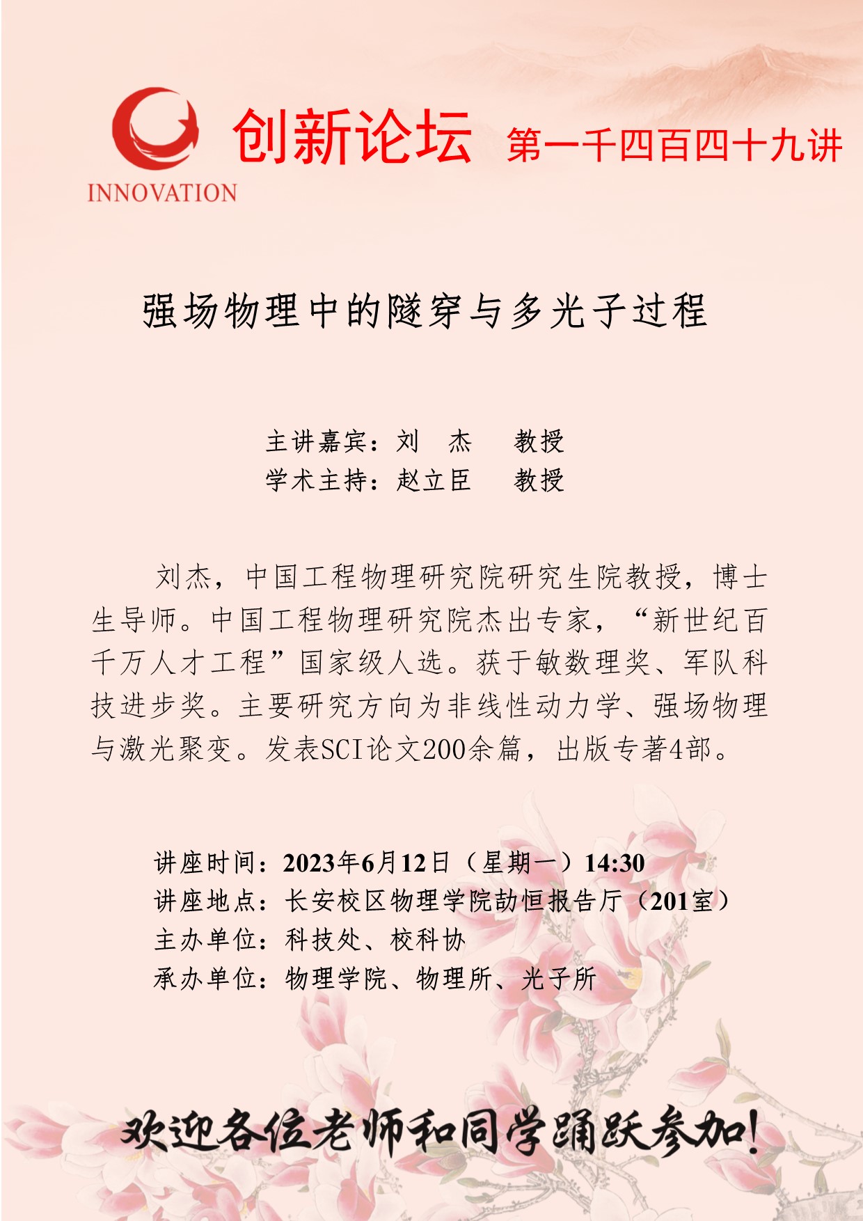 刘 杰 教授 欧冠官方网站创新论坛第一千四百四十九讲:强场物理中的隧穿与多光子过程 讲座时间 2023年6月12日(星期一)14:30 讲座地点 长安校区物理学院劼恒报告厅(201室) 讲座人介绍 刘 杰 教授 讲座内容