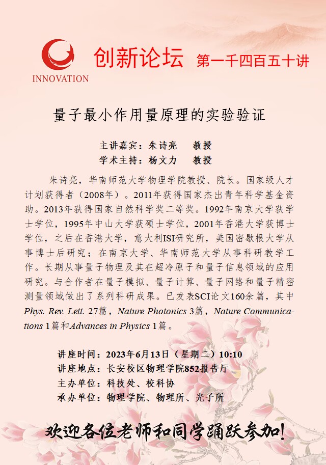 朱诗亮 教授 欧冠官方网站创新论坛第一千四百五十讲:量子最小作用量原理的实验验证 讲座时间 2023年6月13日(星期二)10:10 讲座地点 长安校区物理学院852报告厅 讲座人介绍 朱诗亮 教授 讲座内容