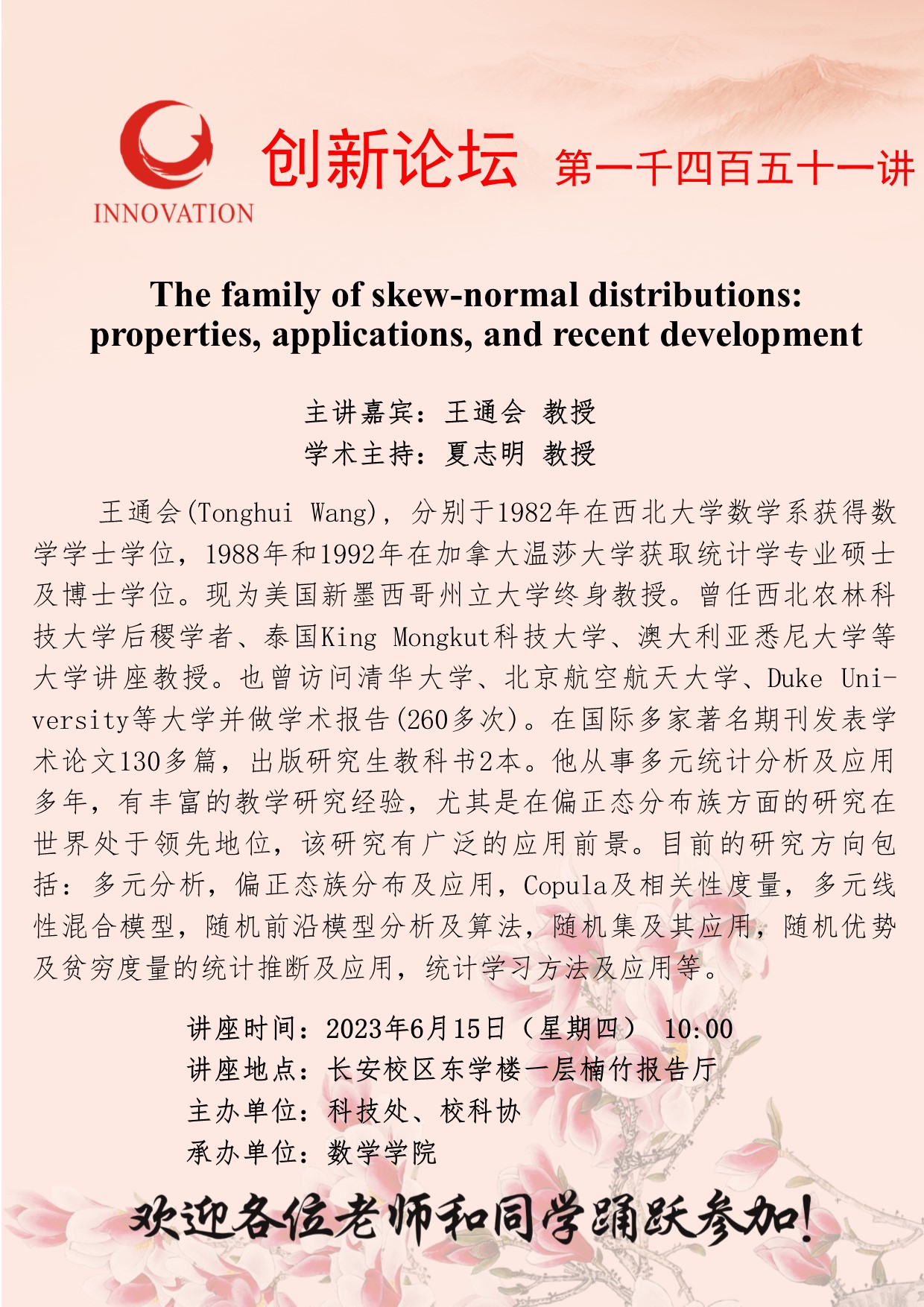 王通会 教授 欧冠官方网站创新论坛第一千四百五十一讲:The family of skew-normal distributions: properties, applications, and recent development 讲座时间 2023年6月15日(星期四) 10:00 讲座地点 长安校区东学楼一层楠竹报告厅 讲座人介绍 王通会 教授 讲座内容