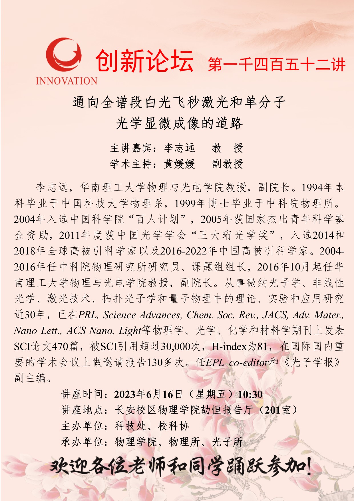 李志远 教授 欧冠官方网站创新论坛第一千四百五十二讲:通向全谱段白光飞秒激光和单分子光学显微成像的道路 讲座时间 2023年6月16日(星期五)10:30 讲座地点 长安校区物理学院劼恒报告厅(201室) 讲座人介绍 李志远 教授 讲座内容
