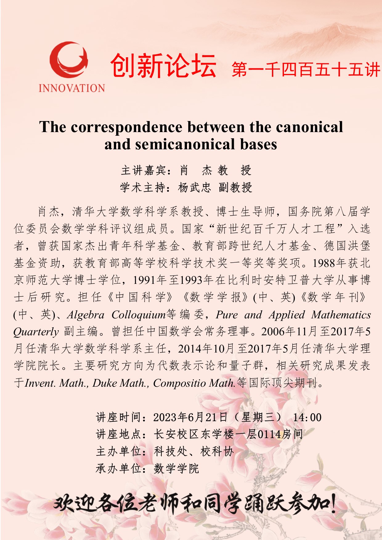 肖杰 教授 欧冠官方网站创新论坛第一千四百五十五讲:The correspondence between the canonical and semicanonical bases 讲座时间 2023年6月21日(星期三) 14:00 讲座地点 长安校区东学楼一层0114房间 讲座人介绍 肖杰 教授 讲座内容