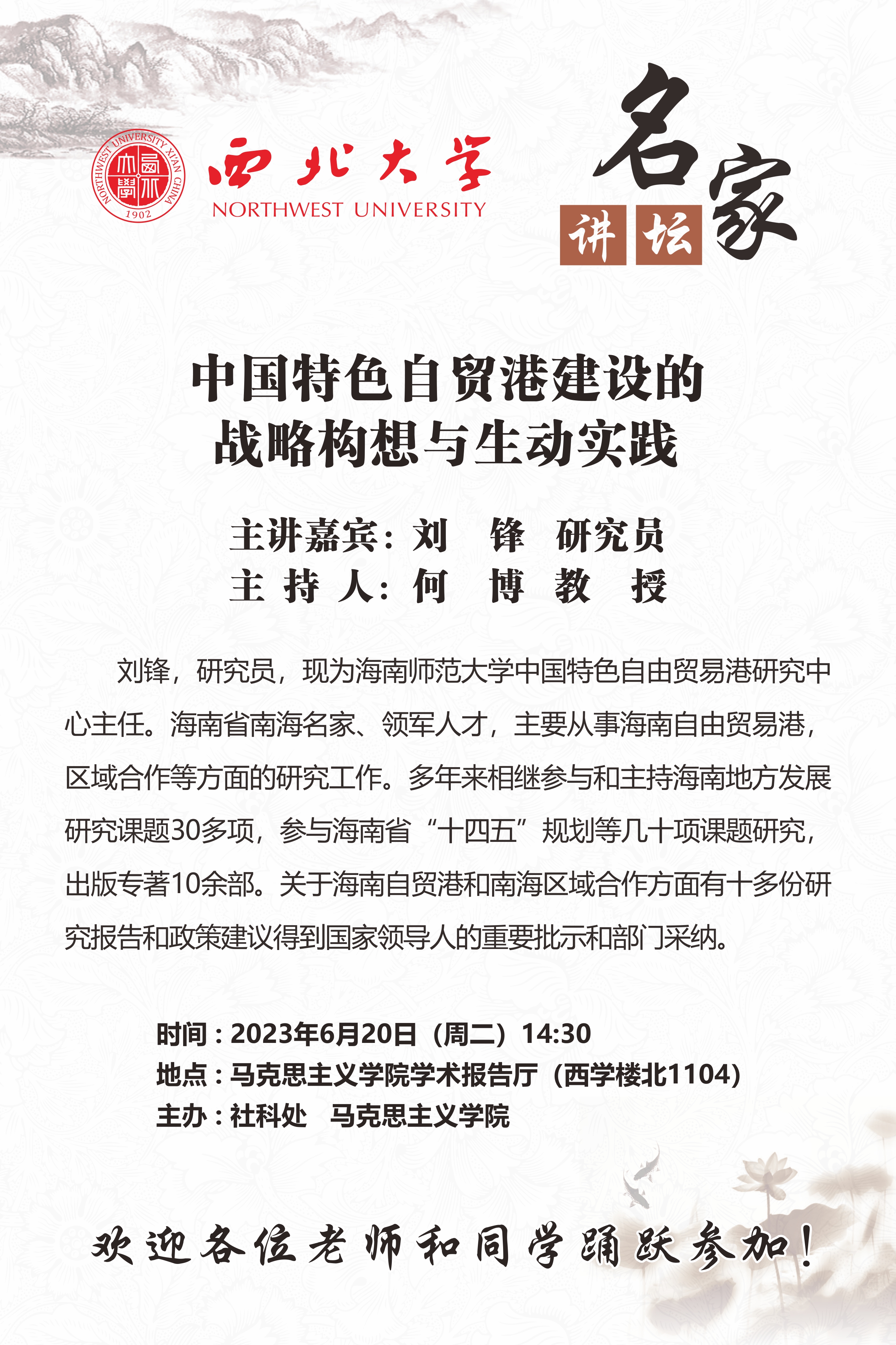 刘锋 研究员 名家讲坛:中国特色自贸港建设的战略构想与生动实践 讲座时间 2023年6月20日(周二)14:30 讲座地点 马克思主义学院学术报告厅(西学楼北1104) 讲座人介绍 刘锋 研究员 讲座内容