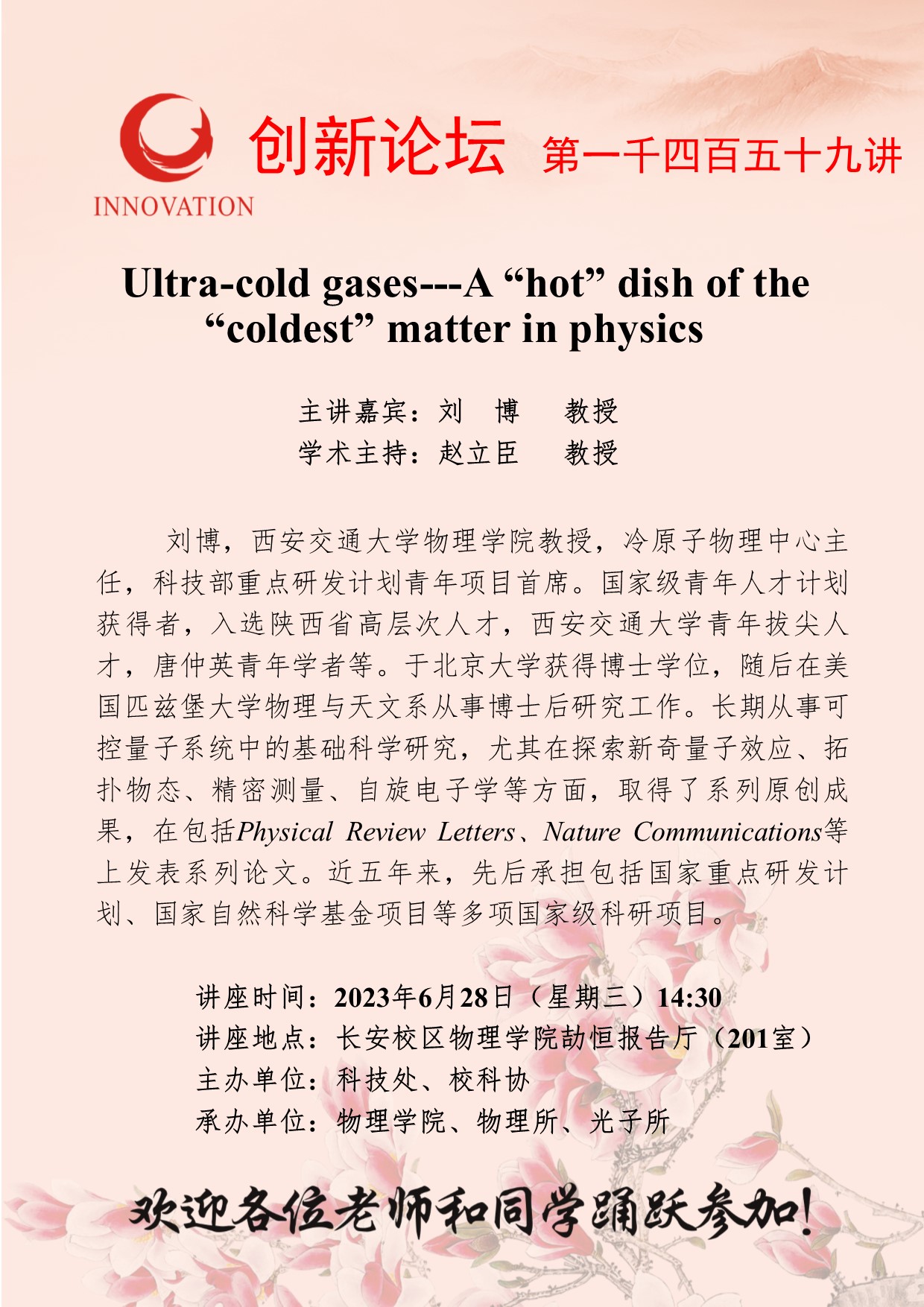 刘 博 教授 欧冠官方网站创新论坛第一千四百五十九讲:Ultra-cold gases---A “hot” dish of the “coldest” matter in physics 讲座时间 2023年6月28日(星期三)14:30 讲座地点 长安校区物理学院劼恒报告厅(201室) 讲座人介绍 刘 博 教授 讲座内容