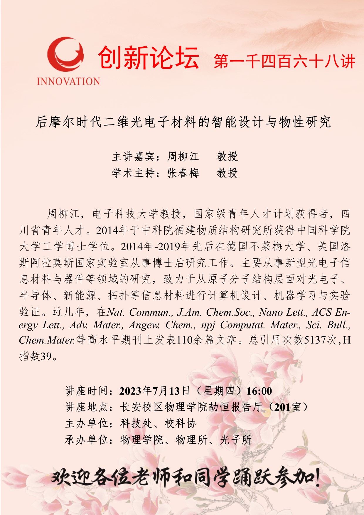 周柳江 教授 欧冠官方网站创新论坛第一千四百六十八讲:后摩尔时代二维光电子材料的智能设计与物性研究 讲座时间 2023年7月13日(星期四)16:00 讲座地点 长安校区物理学院劼恒报告厅(201室) 讲座人介绍 周柳江 教授 讲座内容