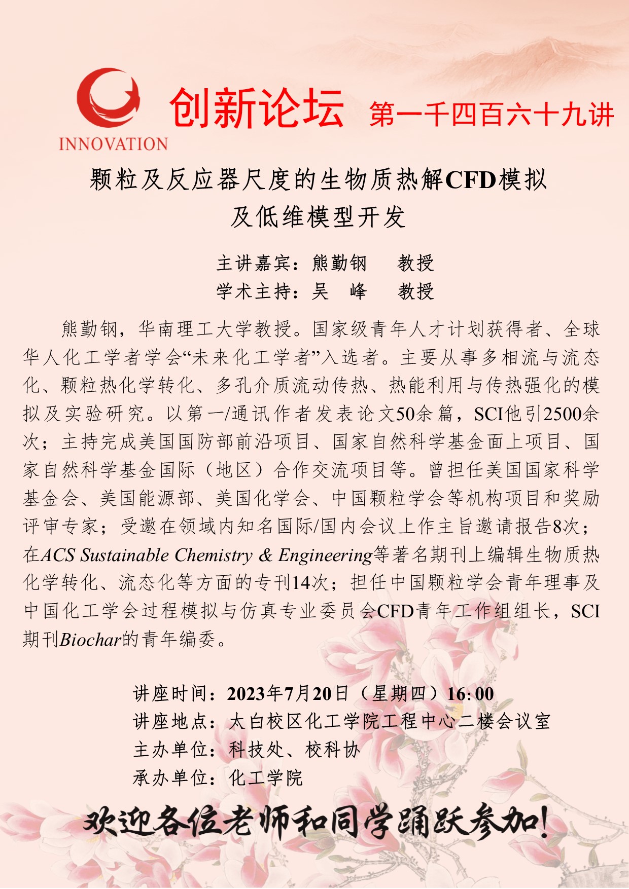 熊勤钢 教授 欧冠官方网站创新论坛第一千四百六十九讲:颗粒及反应器尺度的生物质热解CFD模拟 讲座时间 2023年7月20日(星期四)16:00 讲座地点 太白校区化工学院工程中心二楼会议室 讲座人介绍 熊勤钢 教授 讲座内容