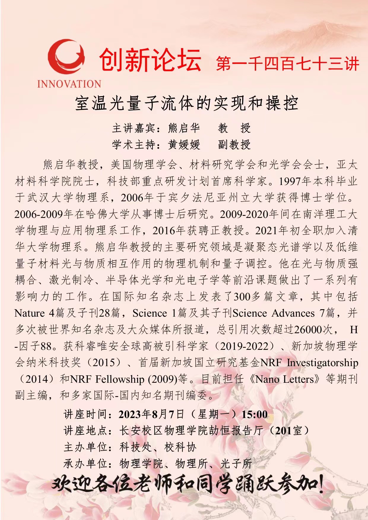 熊启华 教授 欧冠官方网站创新论坛第一千四百七十三讲:温室光量子流体的实现和操控 讲座时间 2023年8月7日(星期一)15:00 讲座地点 长安校区物理学院劼恒报告厅 讲座人介绍 熊启华 教授 讲座内容