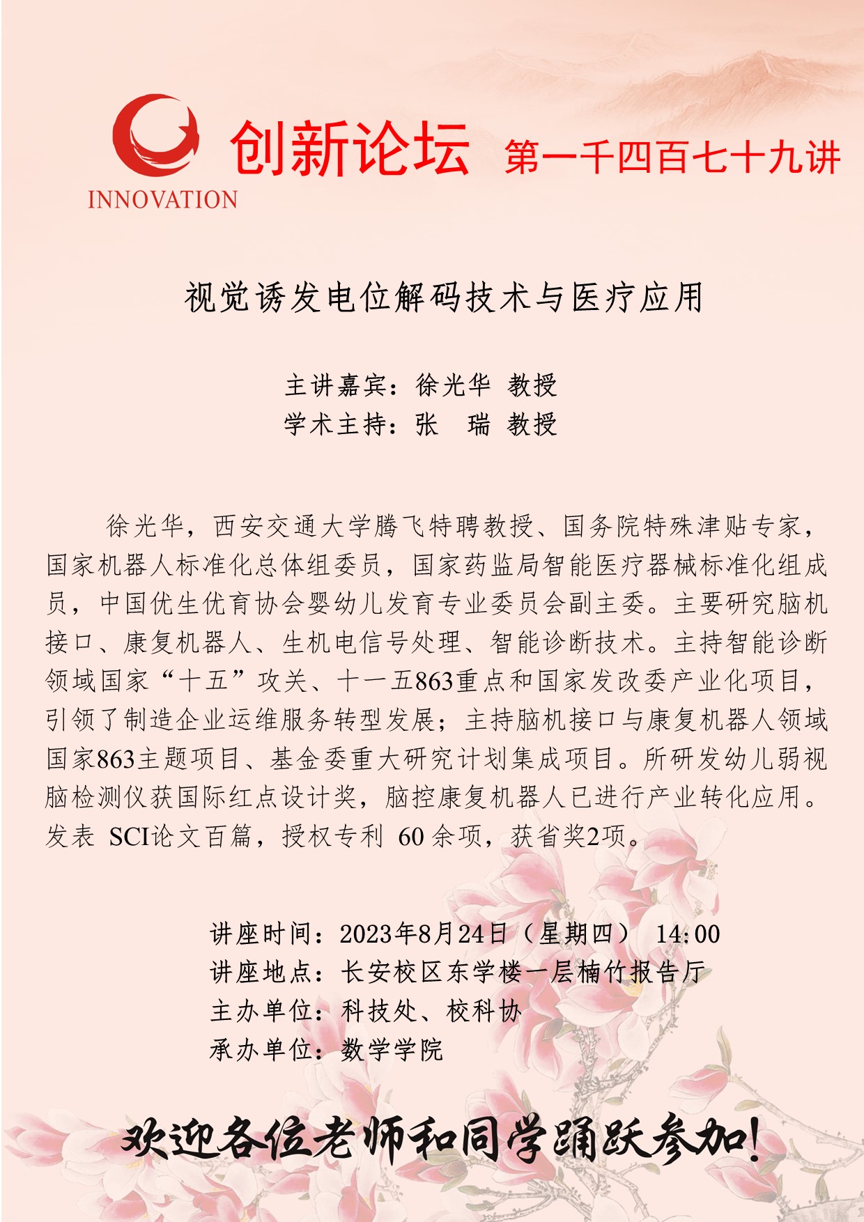 徐光华 教授 欧冠官方网站创新论坛第一千四百七十九讲:视觉诱发电位解码技术与医疗应用 讲座时间 2023年8月24日(星期四) 14:00 讲座地点 长安校区东学楼一层楠竹报告厅 讲座人介绍 徐光华 教授 讲座内容