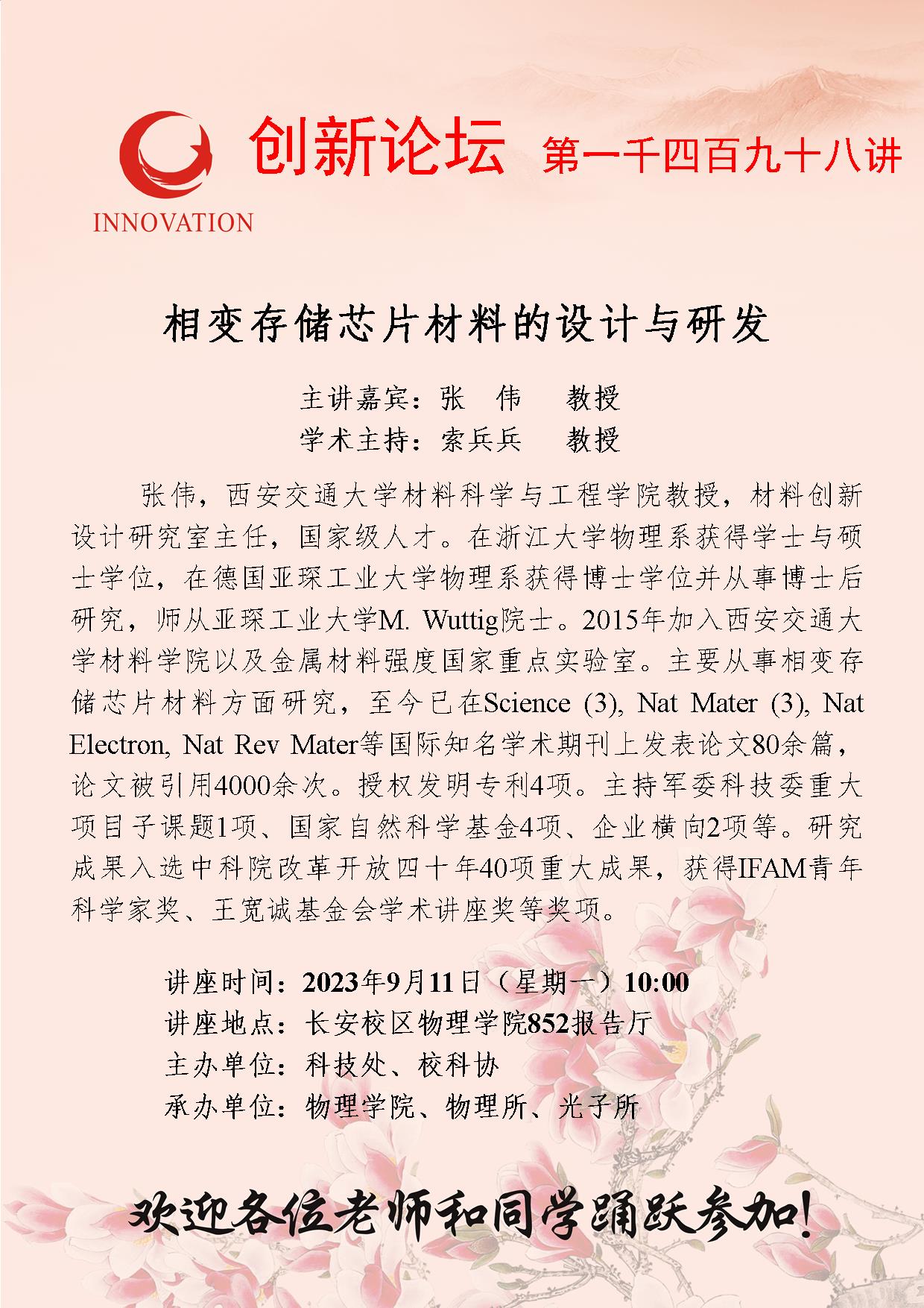 张伟 教授 欧冠官方网站创新论坛第一千四百九十八讲:相变存储芯片材料的设计与研发 讲座时间 2023年9月11日(星期一) 10:00 讲座地点 长安校区物理学院852报告厅 讲座人介绍 张伟 教授 讲座内容