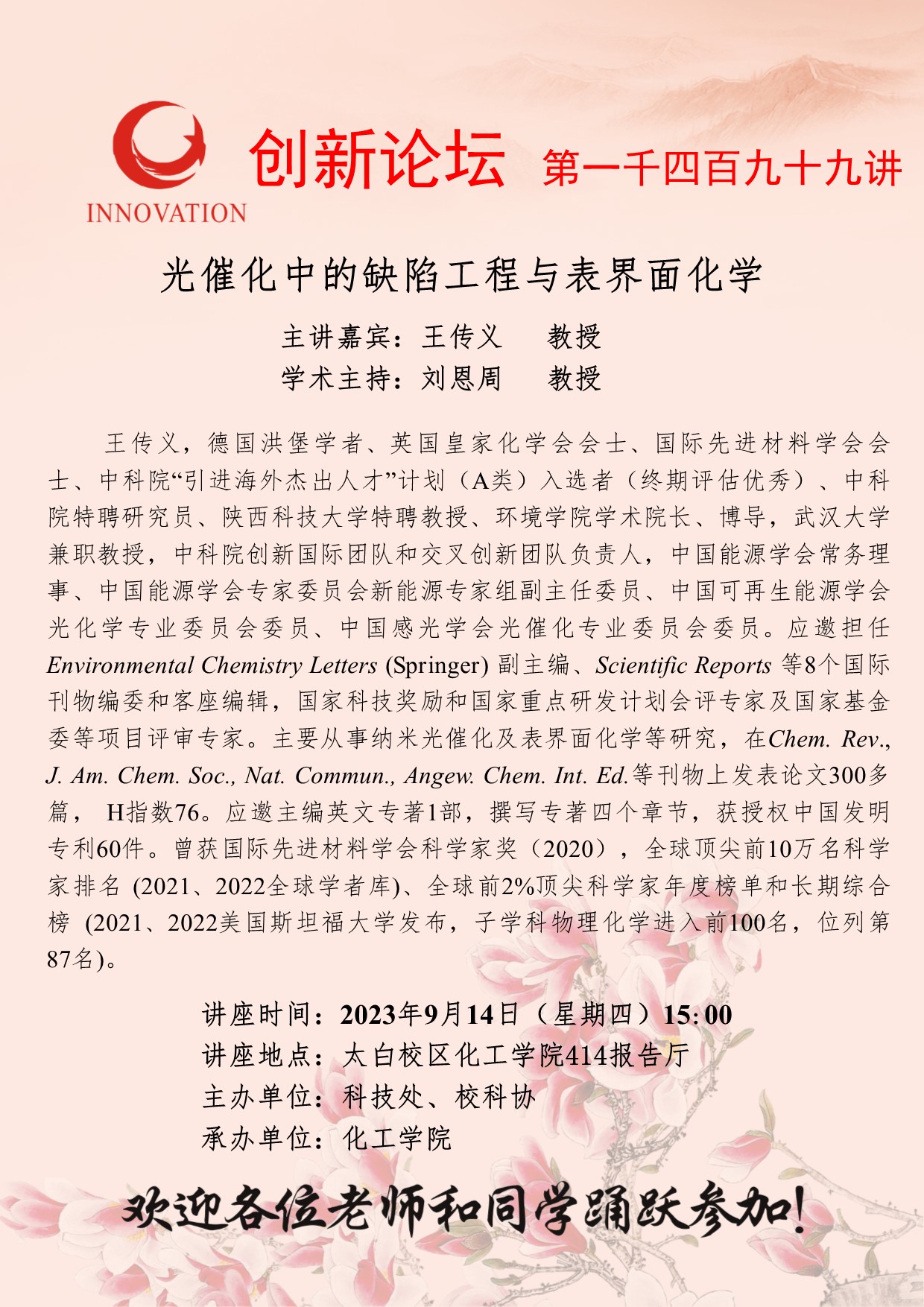 王传义 教授 欧冠官方网站创新论坛第一千四百九十九讲:光催化中的缺陷工程与表界面化学 讲座时间 2023年9月14日(星期四)15:00 讲座地点 太白校区化工学院414报告厅 讲座人介绍 王传义 教授 讲座内容