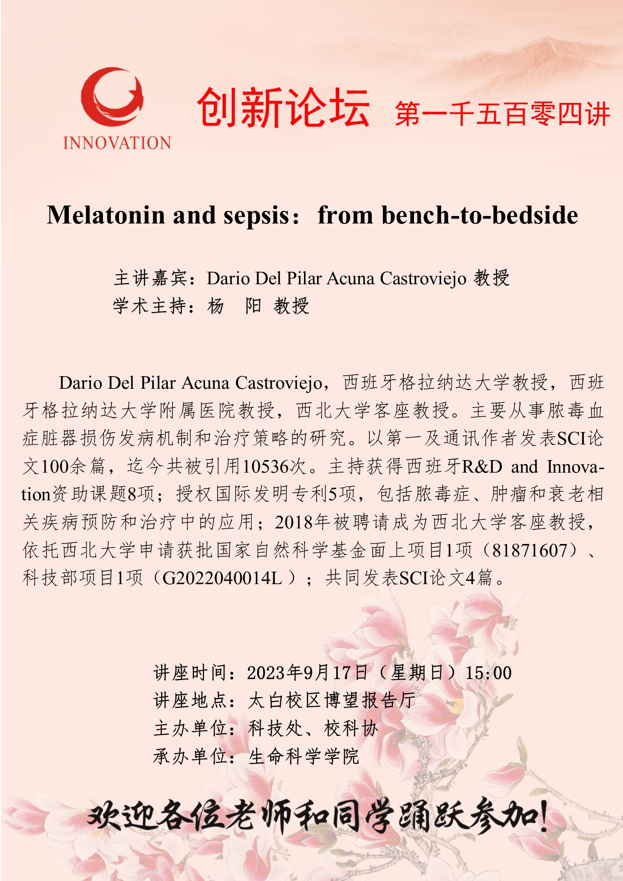 Dario Del Pilar Acuna Castroviejo 教授 欧冠官方网站创新论坛第一千五百零四讲:Melatonin and sepsis:from bench-to-bedside 讲座时间 2023年9月17日(星期日)15:00 讲座地点 太白校区博望报告厅 讲座人介绍 Dario Del Pilar Acuna Castroviejo 教授 讲座内容