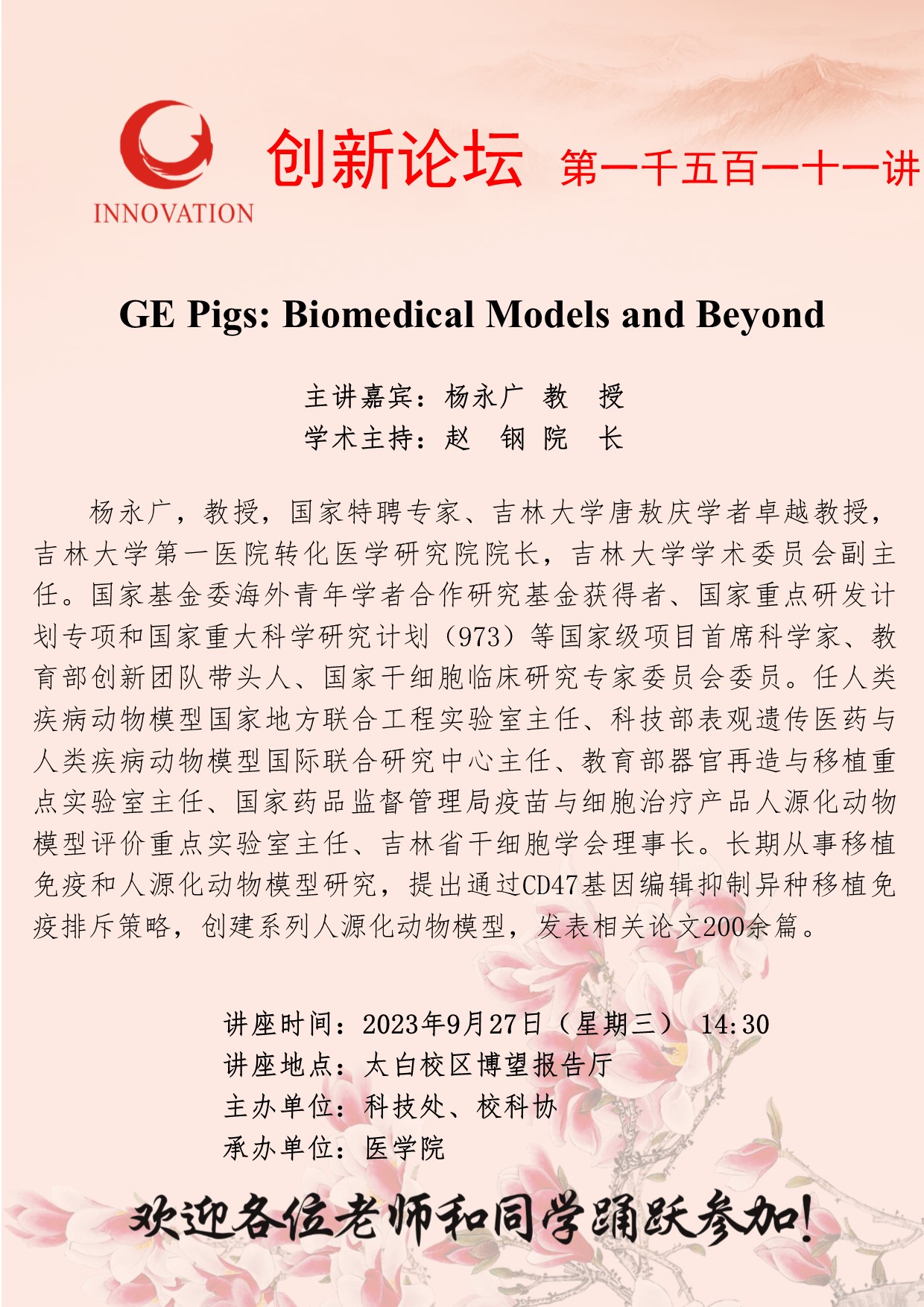 杨永广 教 授 欧冠官方网站创新论坛第一千五百一十一讲:GE Pigs: Biomedical Models and Beyond 讲座时间 2023年9月27日(星期三) 14:30 讲座地点 太白校区博望报告厅 讲座人介绍 杨永广 教 授 讲座内容