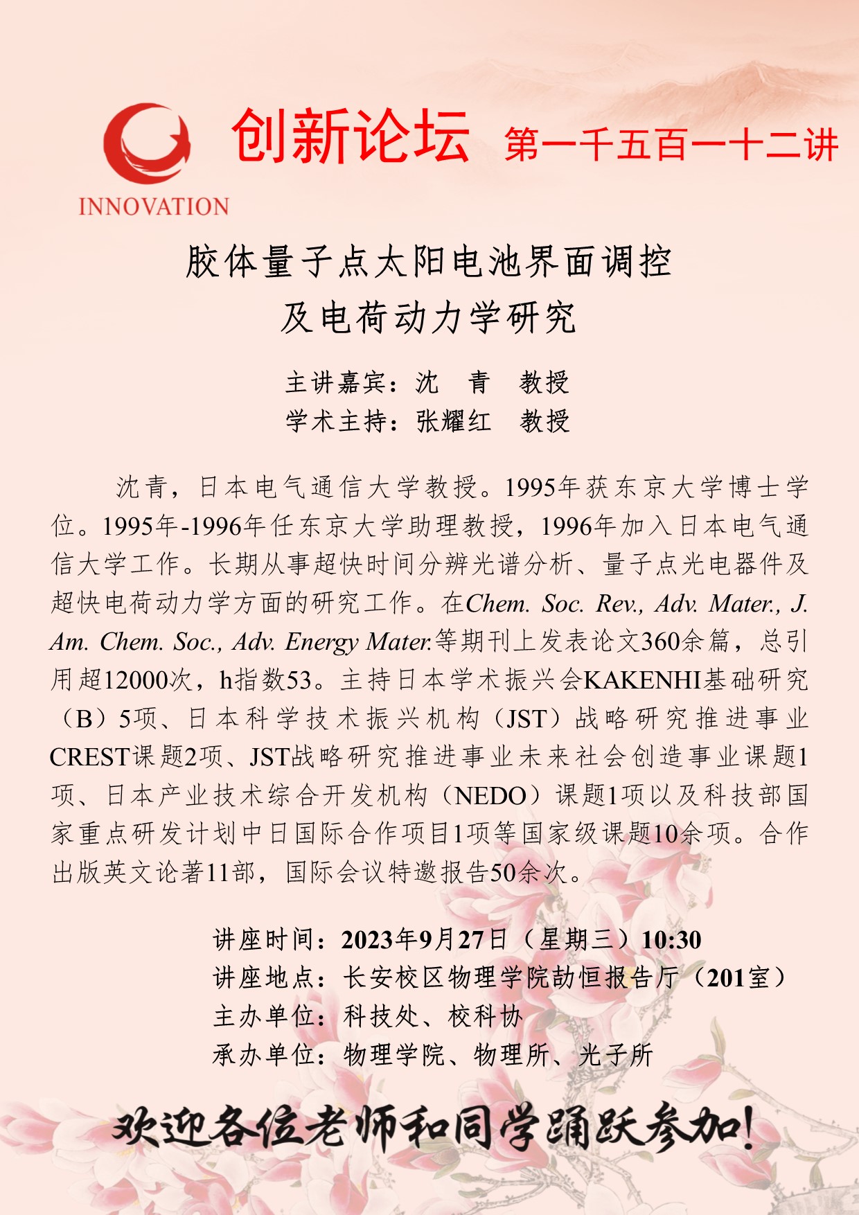 沈青 教授 欧冠官方网站创新论坛第一千五百一十二讲:胶体量子点太阳电池界面调控及电荷动力学研究 讲座时间 2023年9月27日(星期三)10:30 讲座地点 长安校区物理学院劼恒报告厅(201室) 讲座人介绍 沈青 教授 讲座内容