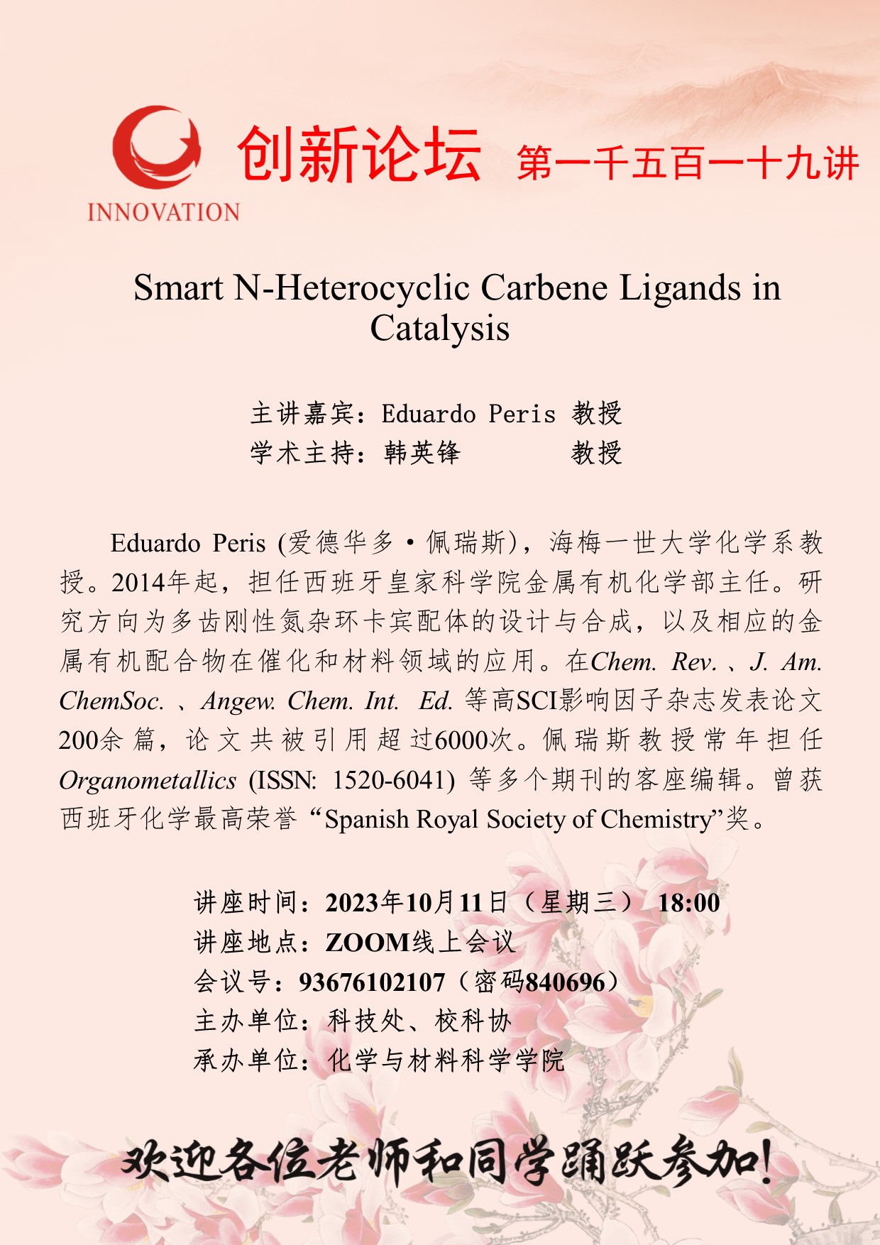 Eduardo Peris 教授 欧冠官方网站创新论坛第一千五百一十九讲: Smart N-Heterocyclic Carbene Ligands in Catalysis 讲座时间 2023年10月11日(星期三) 18:00 讲座地点 ZOOM线上会议 讲座人介绍 Eduardo Peris 教授 讲座内容