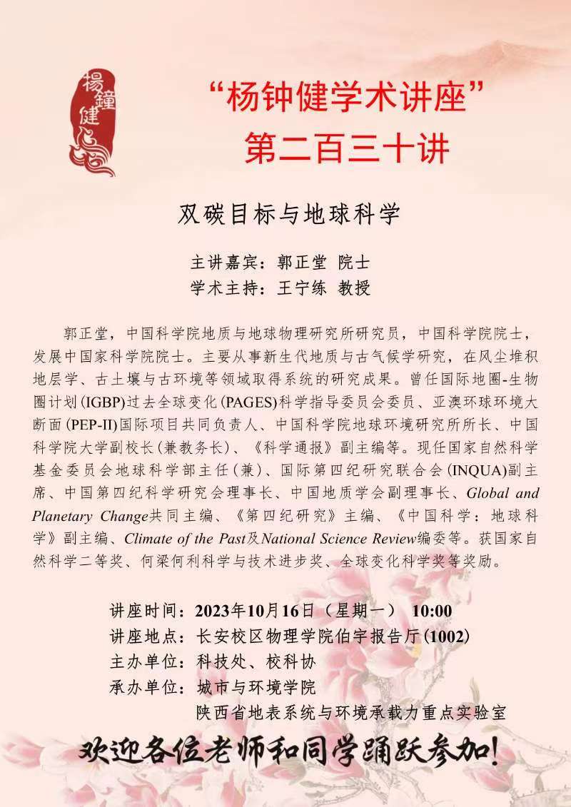 郭正堂 院士 “杨钟健学术讲座”第二百三十讲:双碳目标与地球科学 讲座时间 2023年10月16日(星期一) 10:00 讲座地点 长安校区物理学院伯宇报告厅(1002) 讲座人介绍 郭正堂 院士 讲座内容
