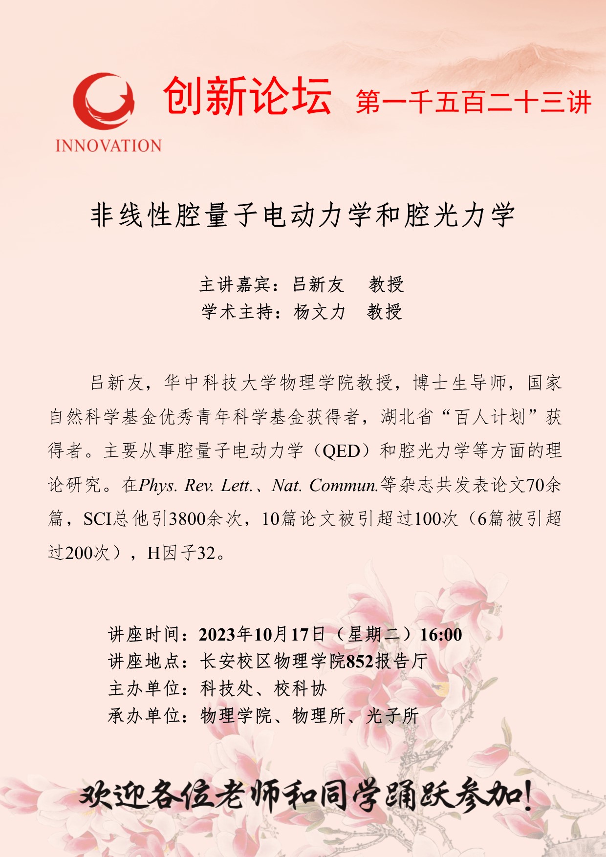 吕新友 教授 欧冠官方网站创新论坛第一千五百二十三讲:非线性腔量子电动力学和腔光力学 讲座时间 2023年10月17日(星期二)16:00 讲座地点 长安校区物理学院852报告厅 讲座人介绍 吕新友 教授 讲座内容