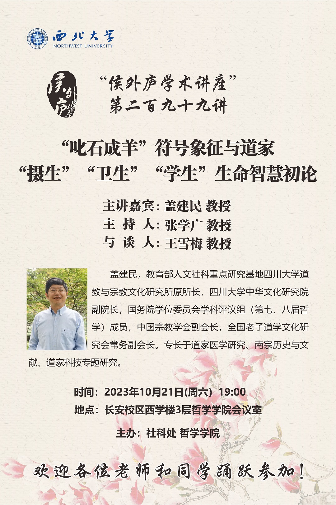盖建民 教授 侯外庐学术讲座第二百九十九讲:“叱石成羊”符号象征与道家“摄生”“卫生”“学生”生命智慧初论 讲座时间 2023年10月21日(周六)19:00 讲座地点 西学楼3层哲学学院会议室 讲座人介绍 盖建民 教授 讲座内容