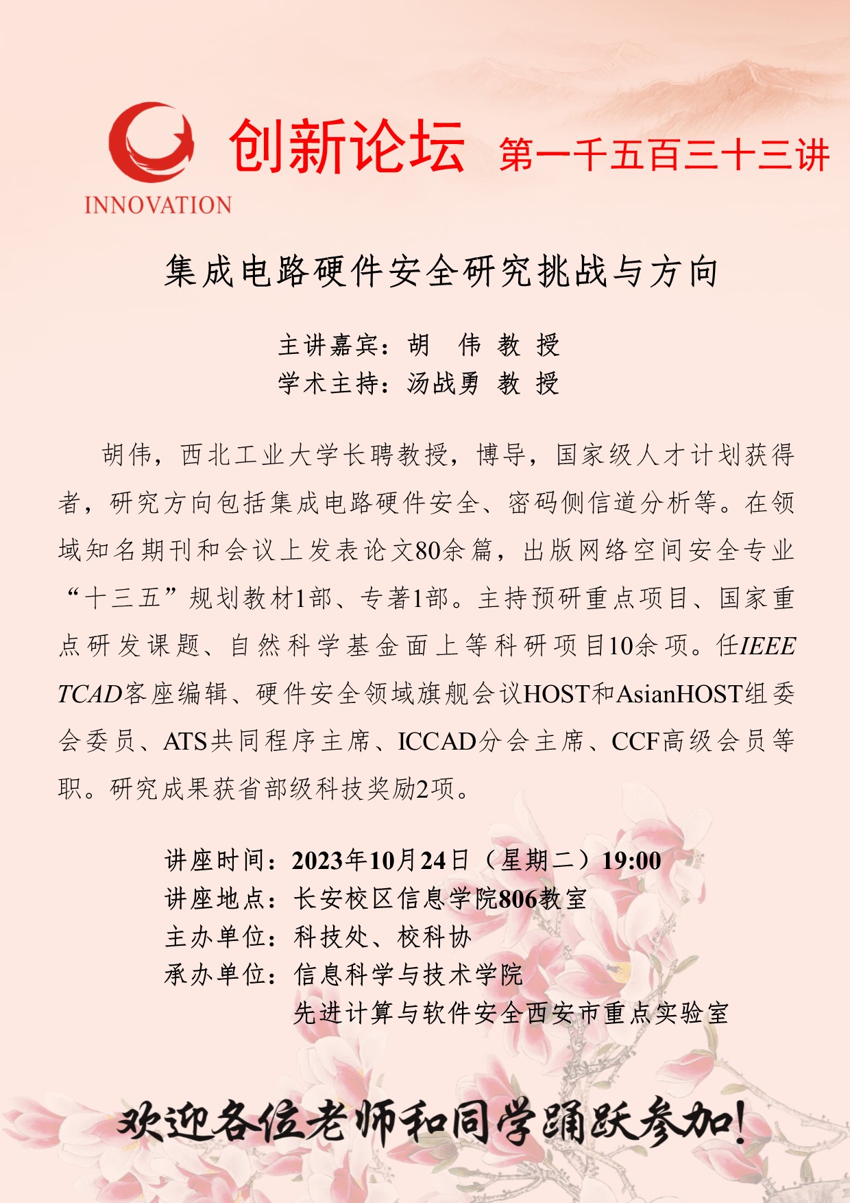 胡 伟 教授 欧冠官方网站创新论坛第一千五百三十三讲:集成电路硬件安全研究挑战与方向 讲座时间 2023年10月24日(星期二)19:00 讲座地点 长安校区信息学院806教室 讲座人介绍 胡 伟 教授 讲座内容