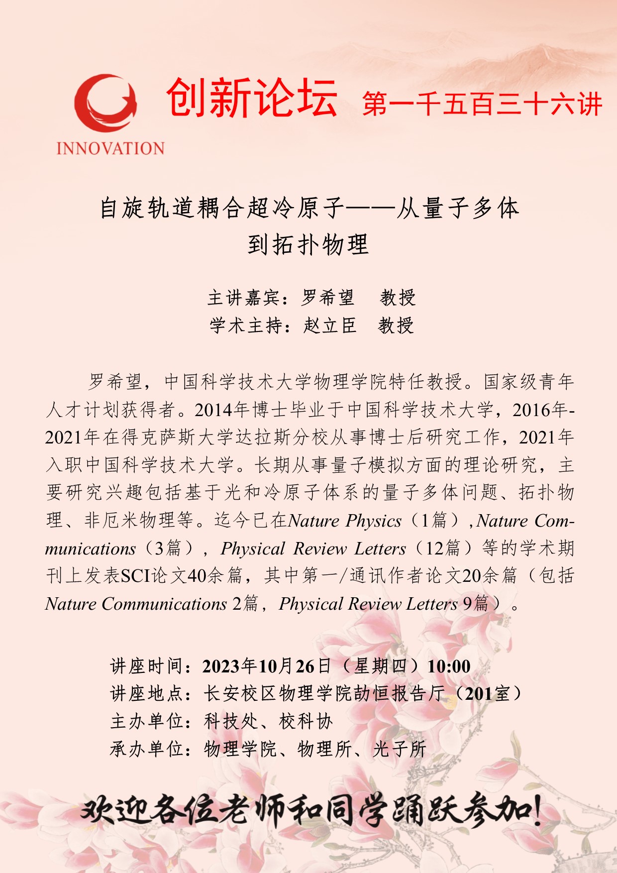 罗希望 教授 欧冠官方网站创新论坛第一千五百三十六讲:自旋轨道耦合超冷原子——从量子多体到拓扑物理 讲座时间 2023年10月26日(星期四)10:00 讲座地点 长安校区物理学院劼恒报告厅(201室) 讲座人介绍 罗希望 教授 讲座内容