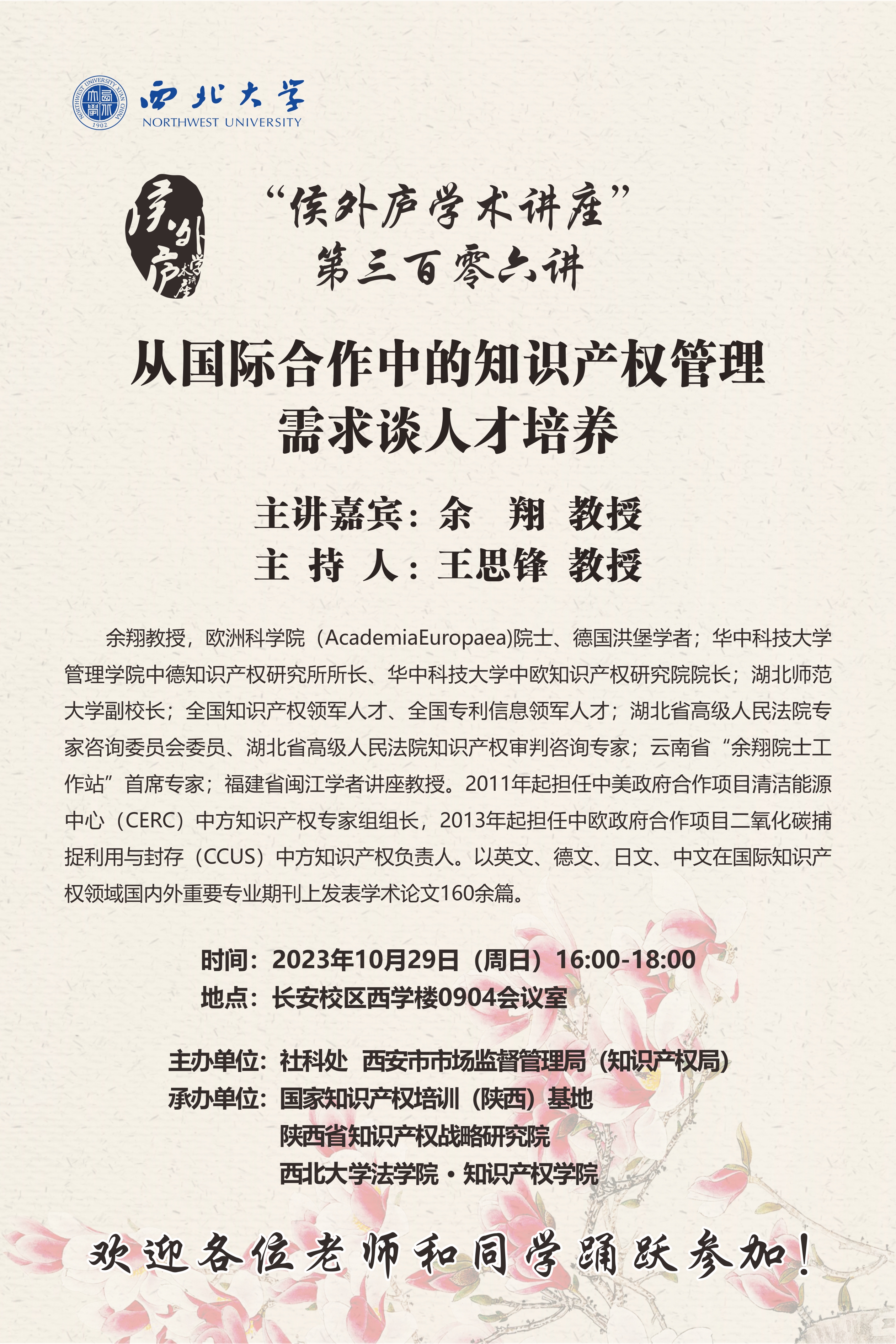 余翔 教授 侯外庐学术讲座第三百零六讲:从国际合作中的知识产权管理需求谈人才培养 讲座时间 2023年10月29日(周日)16:00 讲座地点 长安校区西学楼0904会议室 讲座人介绍 余翔 教授 讲座内容
