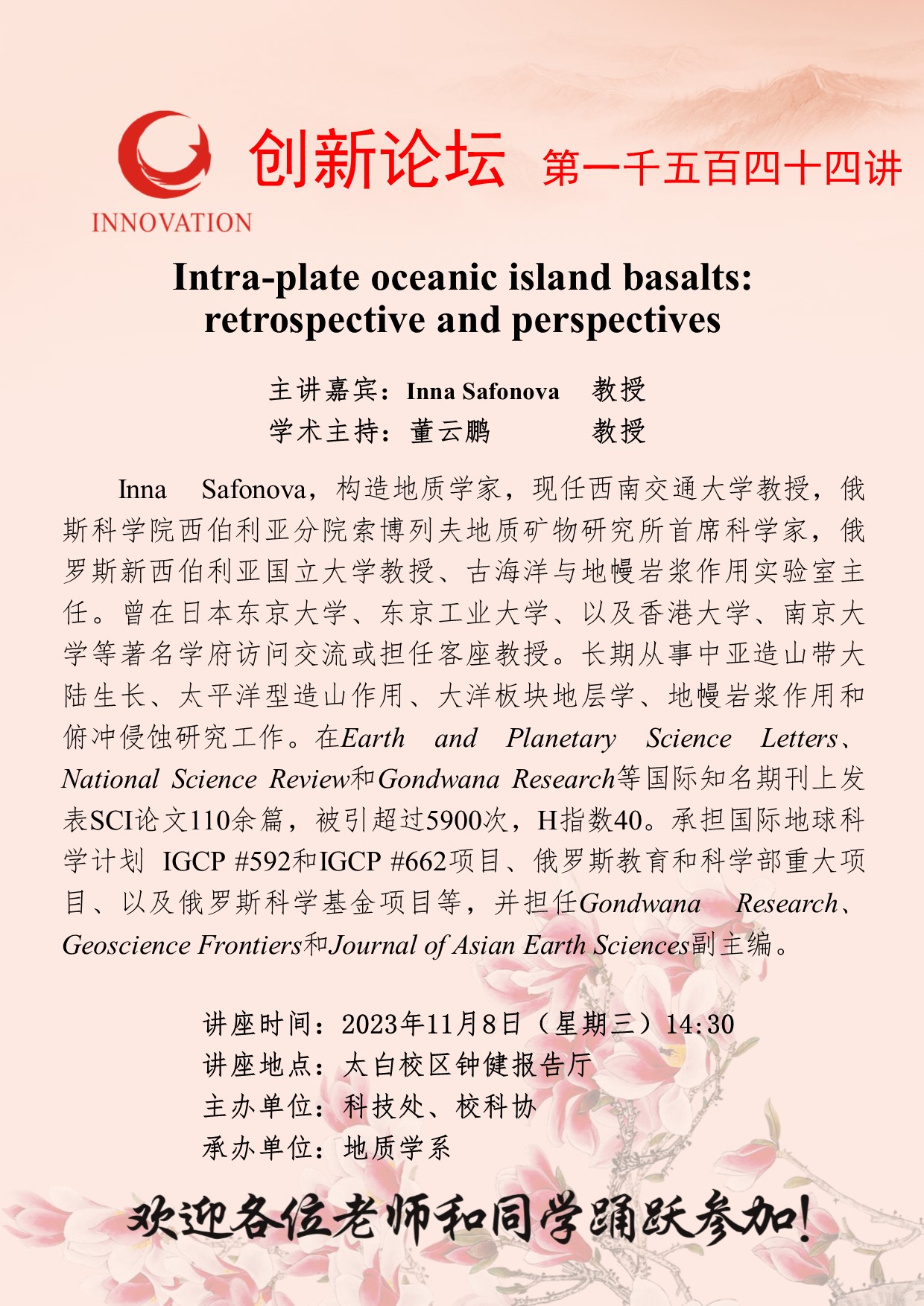 Inna Safonova 教授 欧冠官方网站创新论坛第一千五百四十四讲:Intra-plate oceanic island basalts: retrospective and perspectives 讲座时间 2023年11月8日(星期三)14:30 讲座地点 太白校区钟健报告厅 讲座人介绍 Inna Safonova 教授 讲座内容