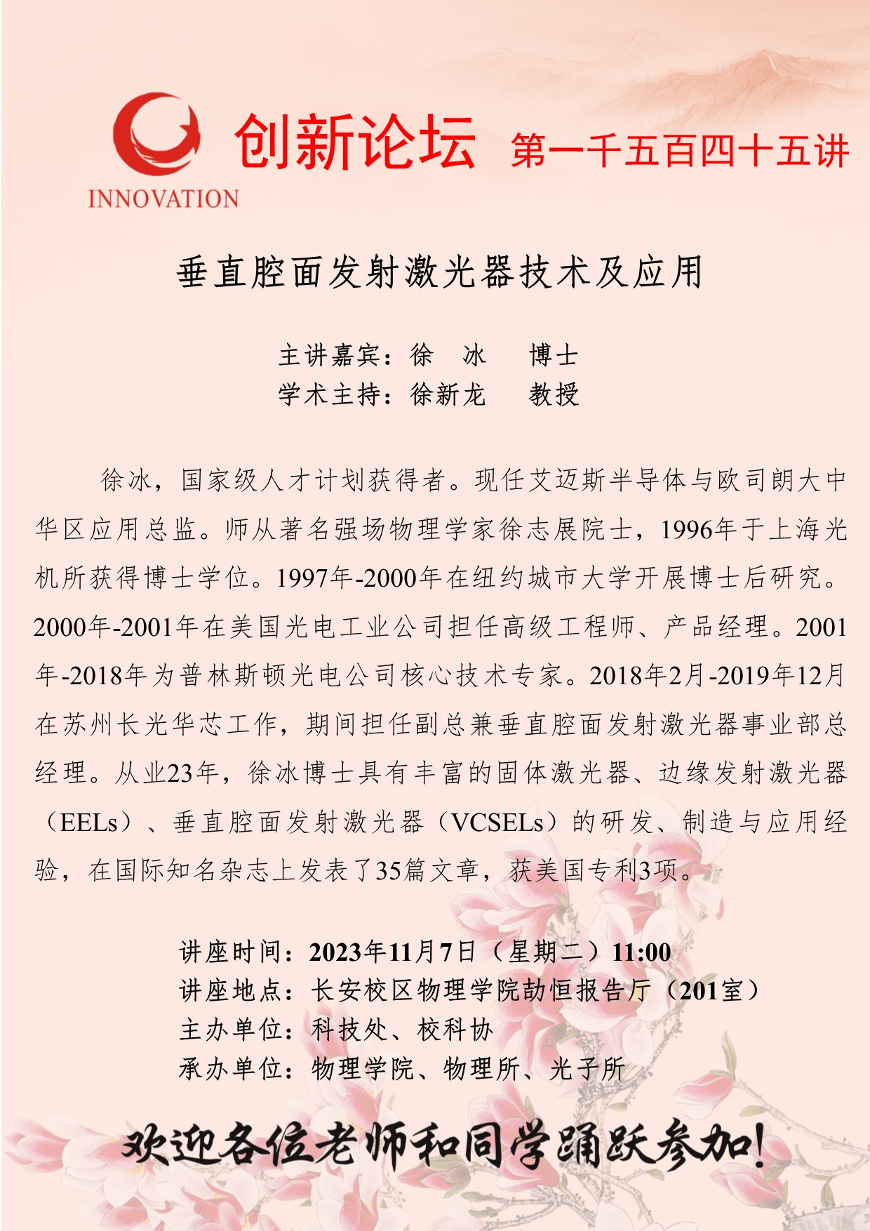 徐冰 博士 欧冠官方网站创新论坛第一千五百四十五讲:垂直腔面发射激光器技术及应用 讲座时间 2023年11月7日(星期二)11:00 讲座地点 长安校区物理学院劼恒报告厅(201室) 讲座人介绍 徐冰 博士 讲座内容