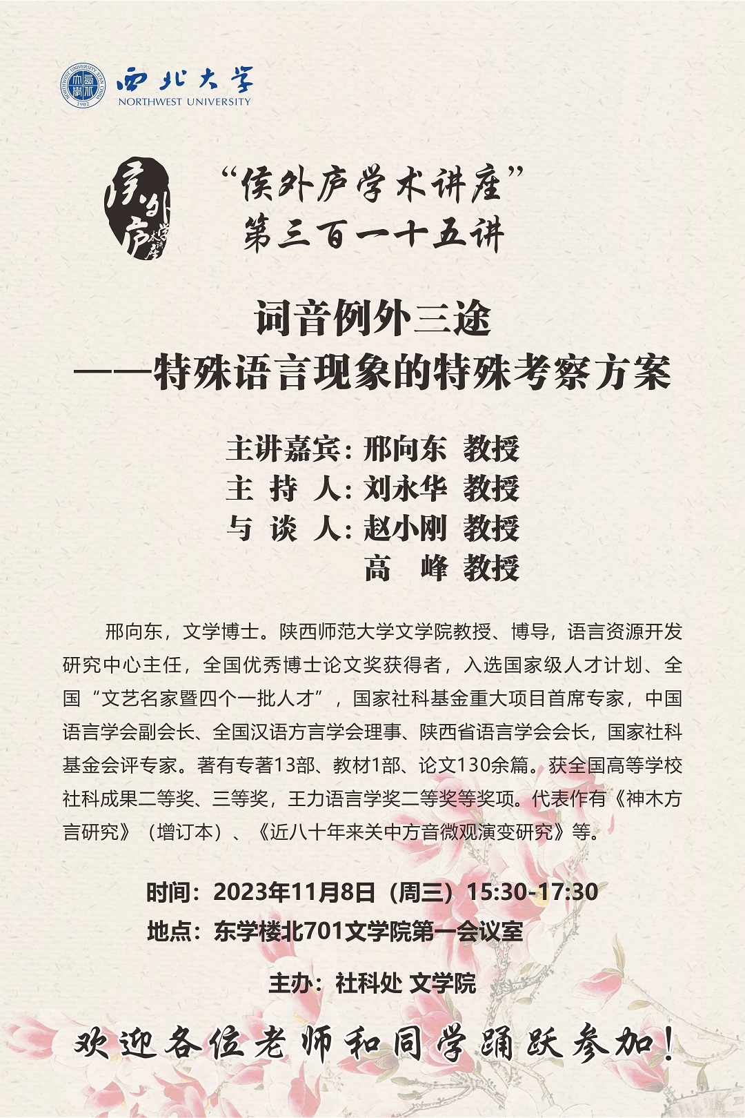 邢向东 教授 侯外庐学术讲座第三百一十五讲:词音例外三途——特殊语言现象的特殊考察方案 讲座时间 2023年11月8日(周三)15:30 讲座地点 东学楼北701文学院第一会议室 讲座人介绍 邢向东 教授 讲座内容