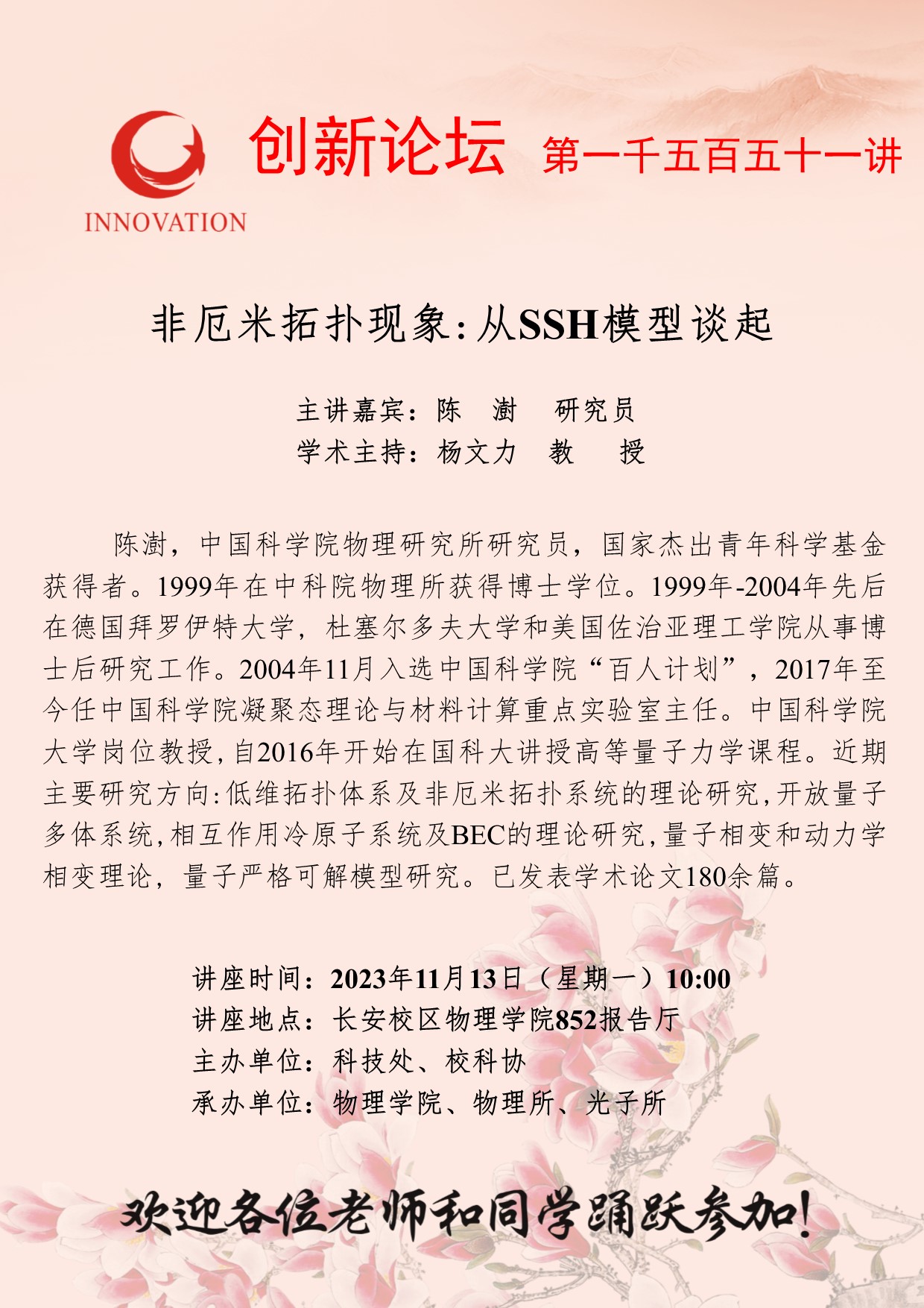陈澍 研究员 欧冠官方网站创新论坛第一千五百五十一讲:非厄米拓扑现象:从SSH模型谈起 讲座时间 2023年11月13日(星期一)10:00 讲座地点 长安校区物理学院852报告厅 讲座人介绍 陈澍 研究员 讲座内容