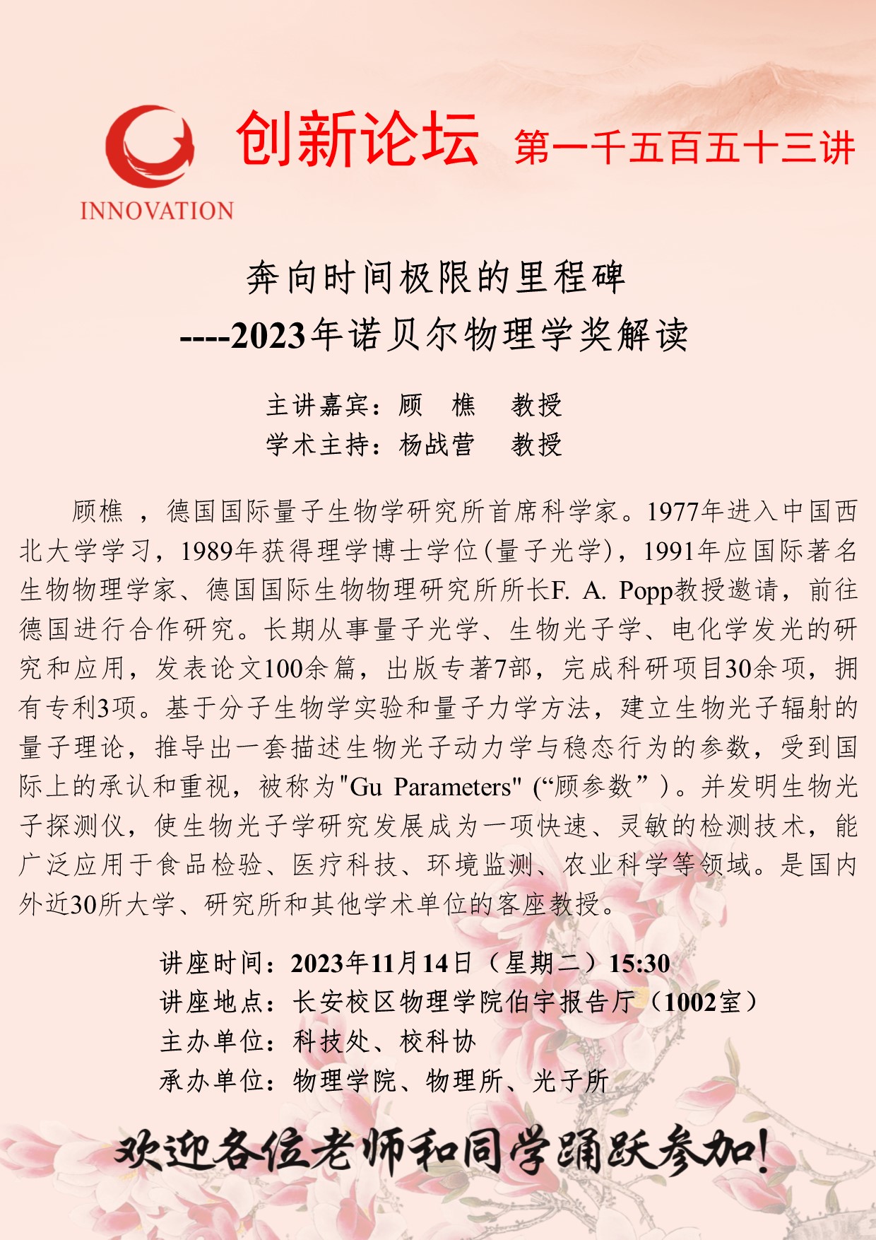 顾樵 教授 欧冠官方网站创新论坛第一千五百五十三讲:奔向时间极限的里程碑----2023年诺贝尔物理学奖解读 讲座时间 2023年11月14日(星期二)15:30 讲座地点 长安校区物理学院伯宇报告厅(1002室) 讲座人介绍 顾樵 教授 讲座内容