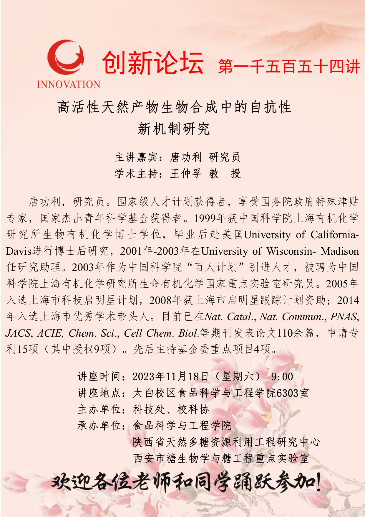 唐功利 研究员 欧冠官方网站创新论坛第一千五百五十四讲:高活性天然产物生物合成中的自抗性 新机制研究 讲座时间 2023年11月18日(星期六) 9:00 讲座地点 太白校区食品科学与工程学院6303室 讲座人介绍 唐功利 研究员 讲座内容