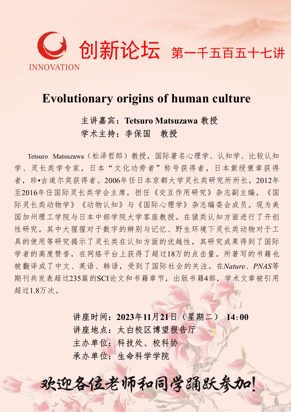 Tetsuro Matsuzawa 教授 欧冠官方网站创新论坛第一千五百五十七讲:Evolutionary origins of human culture 讲座时间 2023年11月21日(星期二) 14:00 讲座地点 太白校区博望报告厅 讲座人介绍 Tetsuro Matsuzawa 教授 讲座内容