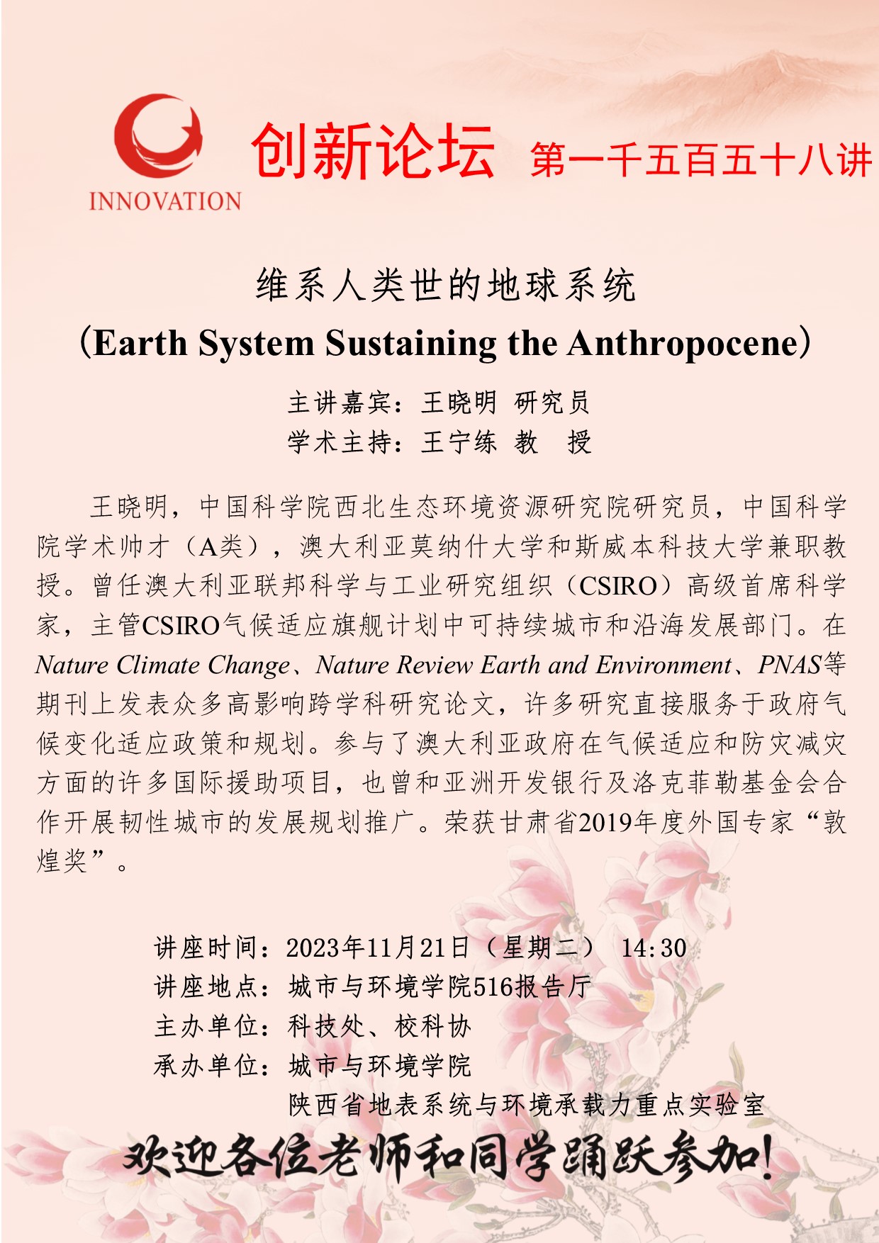 王晓明 研究员 欧冠官方网站创新论坛第一千五百五十八讲:维系人类世的地球系统 讲座时间 2023年11月21日(星期二) 14:30 讲座地点 城市与环境学院516报告厅 讲座人介绍 王晓明 研究员 讲座内容