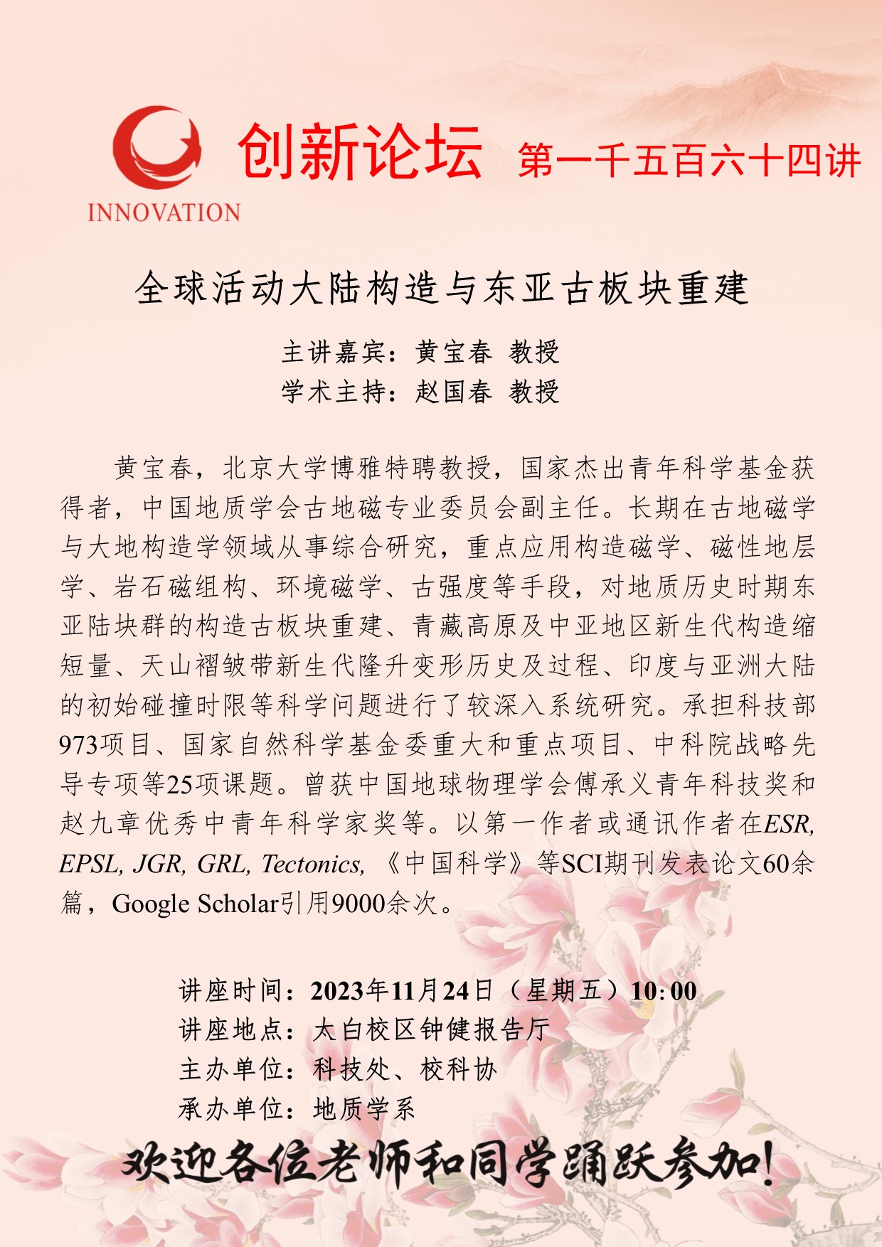 黄宝春 教授 欧冠官方网站创新论坛第一千五百六十四讲:全球活动大陆构造与东亚古板块重建 讲座时间 2023年11月24日(星期五)10:00 讲座地点 太白校区钟健报告厅 讲座人介绍 黄宝春 教授 讲座内容