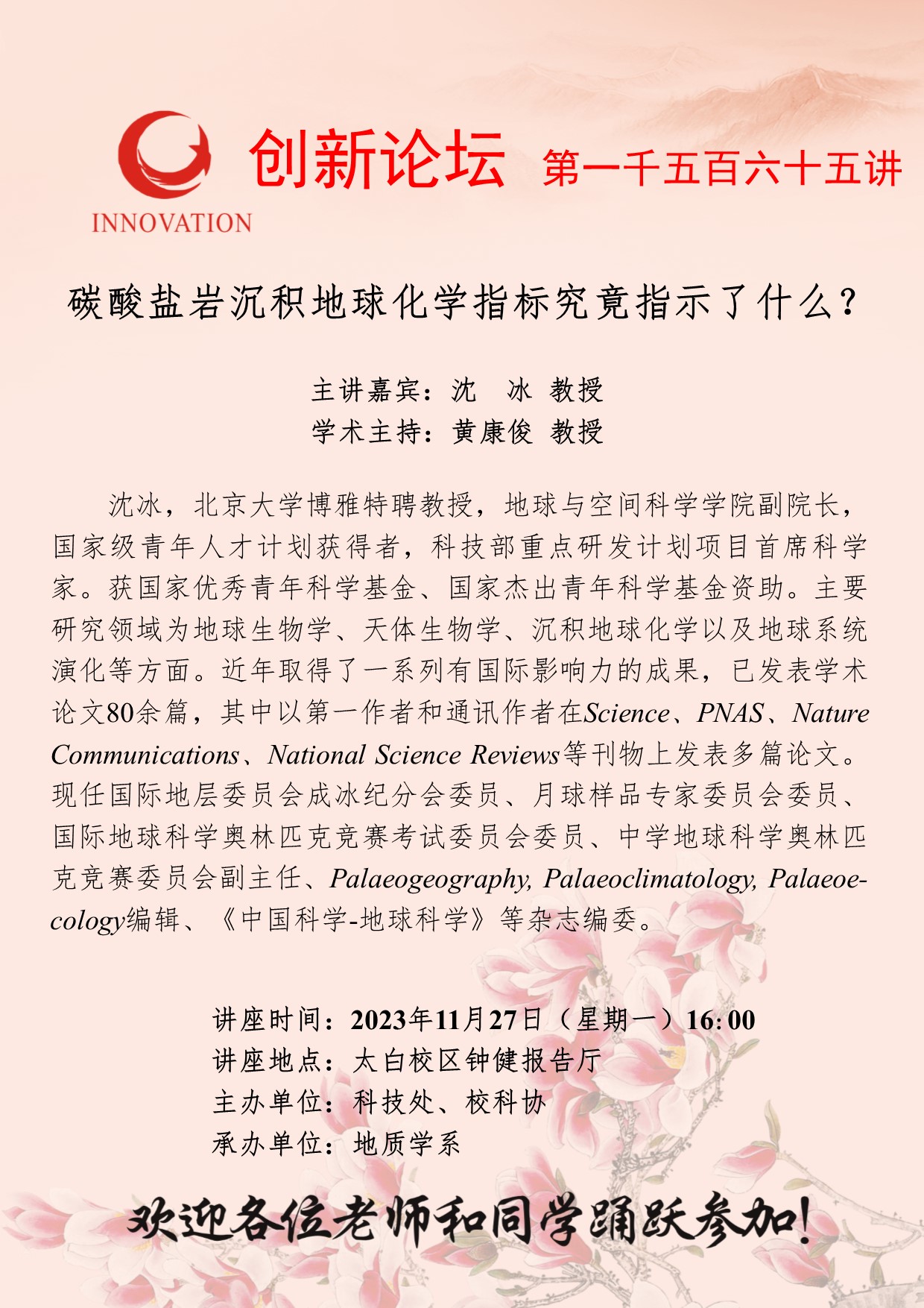 沈冰 教授 欧冠官方网站创新论坛第一千五百六十五讲:碳酸盐岩沉积地球化学指标究竟指示了什么? 讲座时间 2023年11月27日(星期一)16:00 讲座地点 太白校区钟健报告厅 讲座人介绍 沈冰 教授 讲座内容