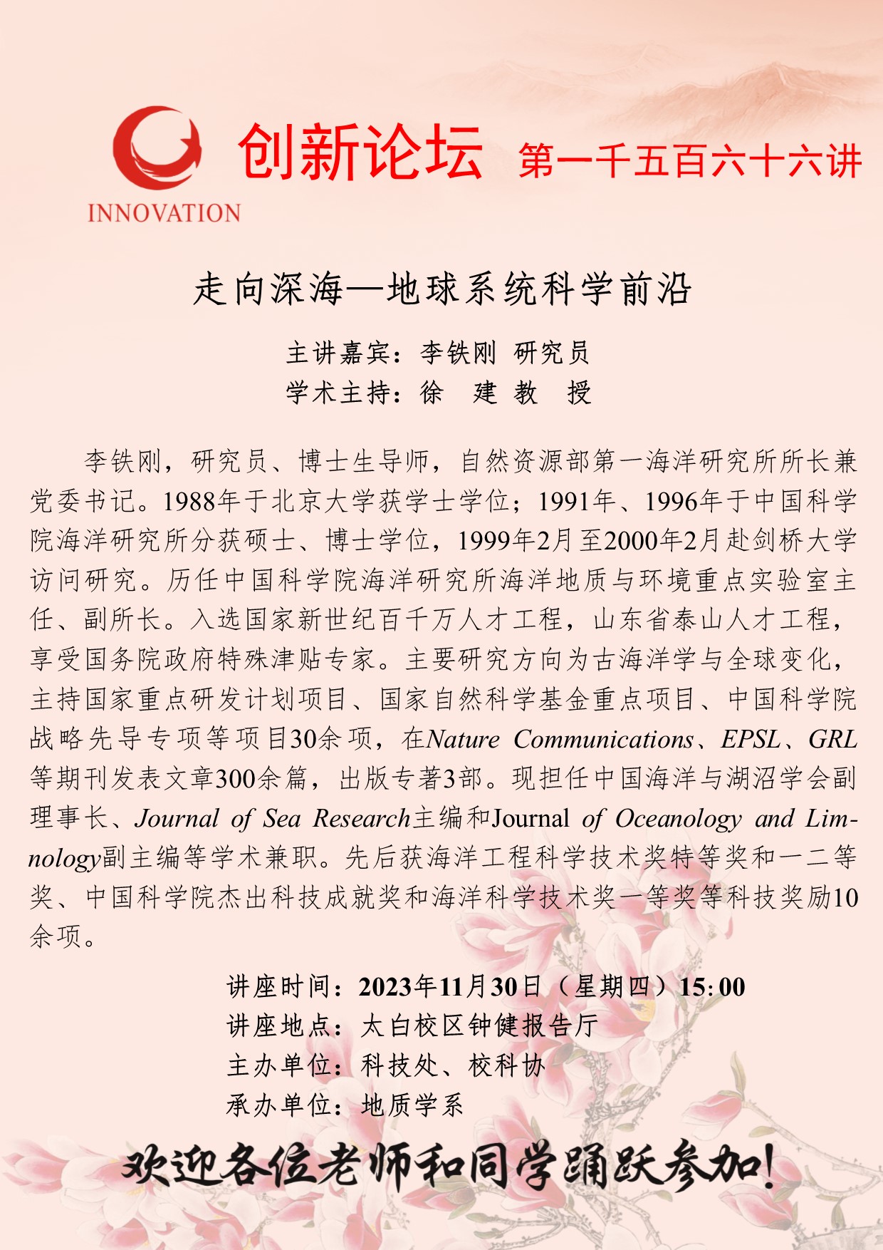 李铁刚 研究员 欧冠官方网站创新论坛第一千五百六十六讲:走向深海—地球系统科学前沿 讲座时间 2023年11月30日(星期四)15:00 讲座地点 太白校区钟健报告厅 讲座人介绍 李铁刚 研究员 讲座内容