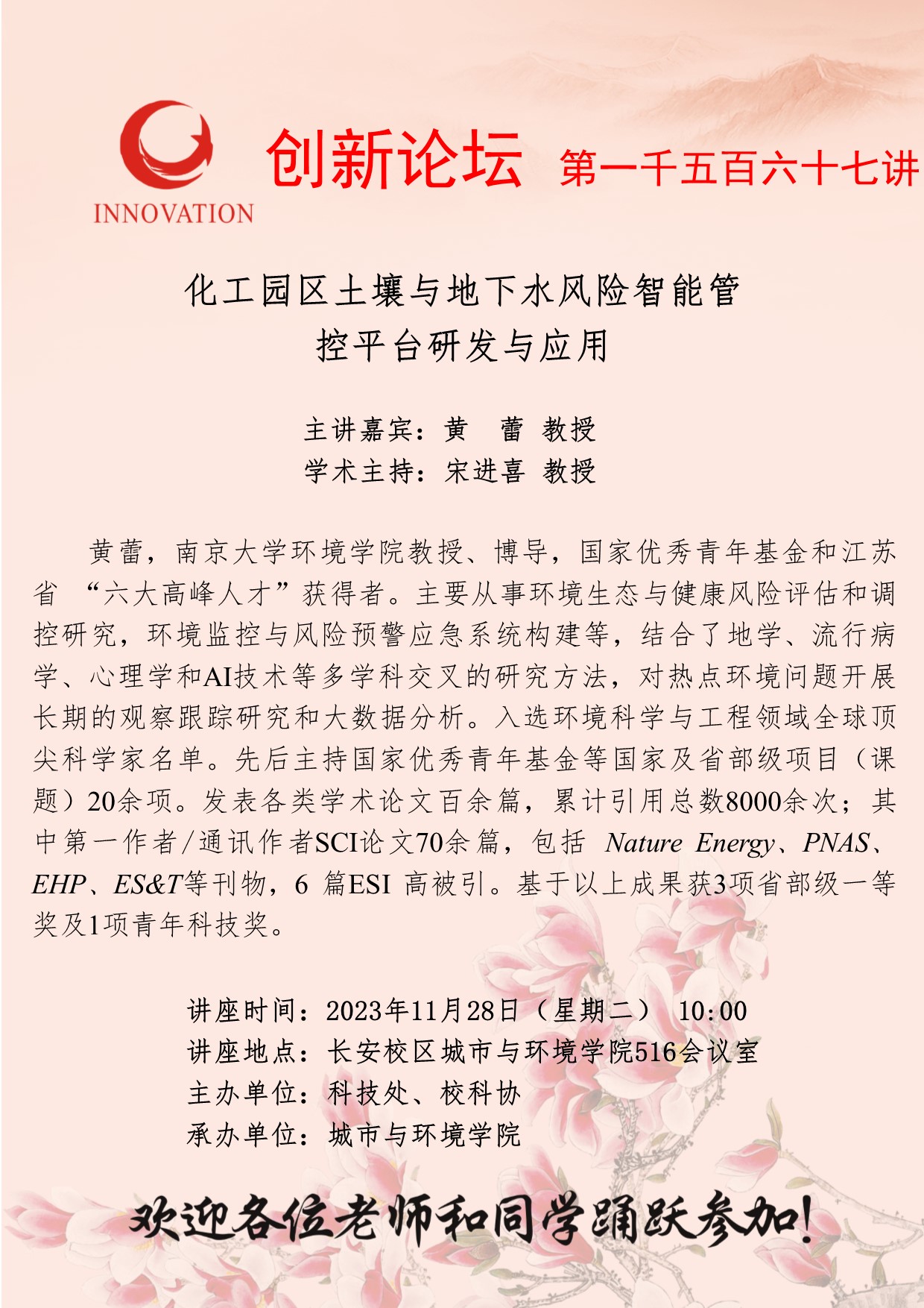 黄蕾 教授 欧冠官方网站创新论坛第一千五百六十七讲:化工园区土壤与地下水风险智能管控平台研发与应用 讲座时间 2023年11月28日(星期二) 10:00 讲座地点 长安校区城市与环境学院516会议室 讲座人介绍 黄蕾 教授 讲座内容