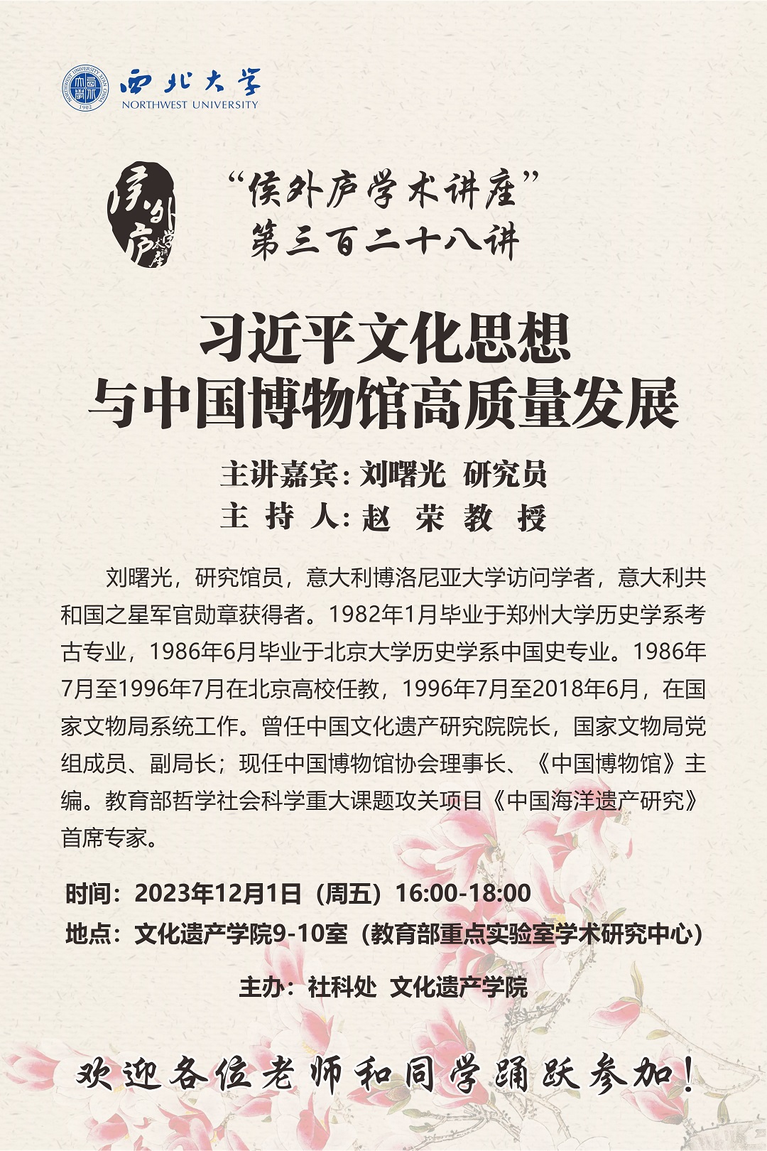 刘曙光 研究员 侯外庐学术讲座第三百二十八讲:习近平文化思想与中国博物馆高质量发展 讲座时间 2023 年 12 月1日(周五)16:00 讲座地点 文化遗产学院9-10室 (教育部重点实验室学术研究中心) 讲座人介绍 刘曙光 研究员 讲座内容