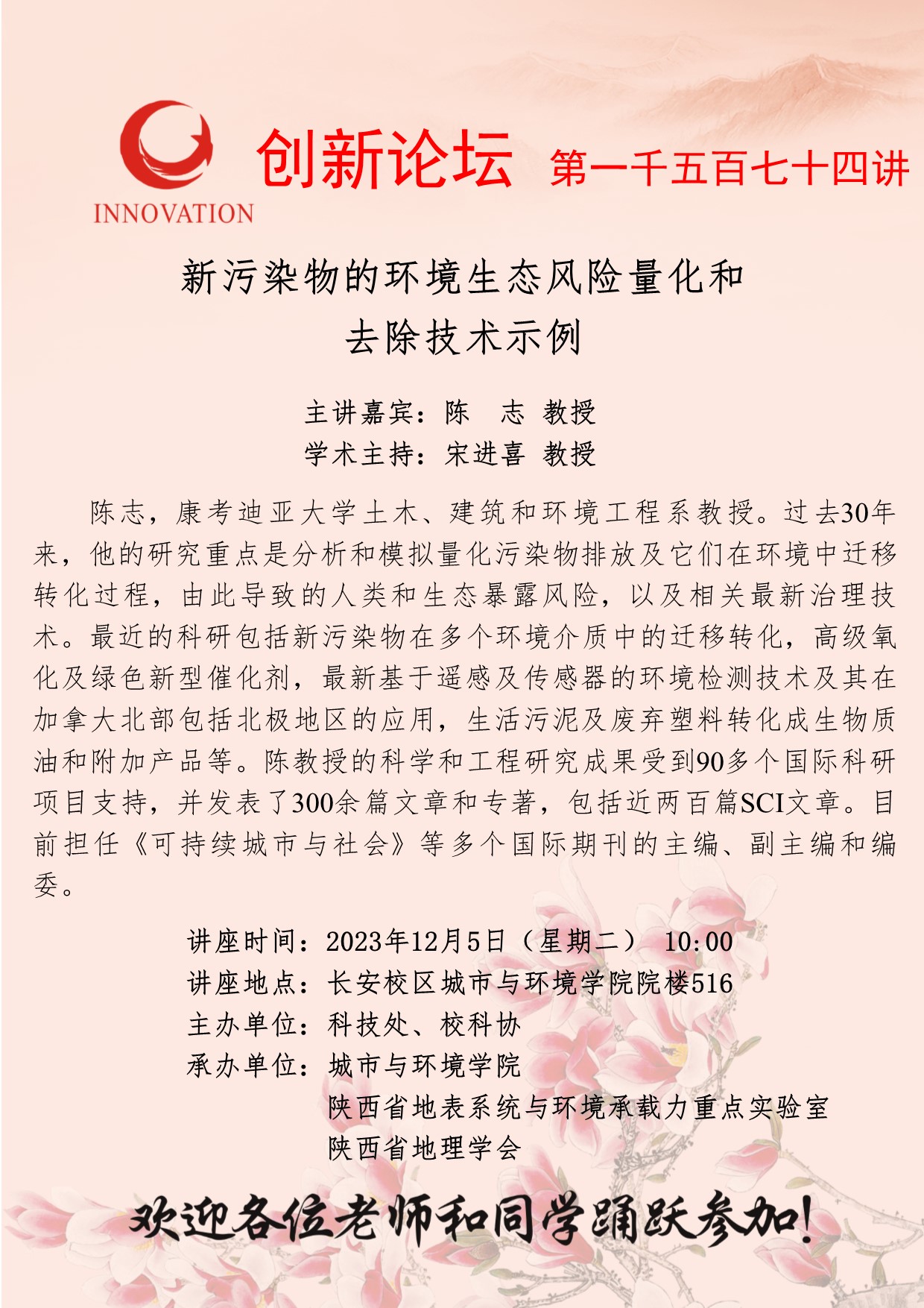陈志 教授 欧冠官方网站创新论坛第一千五百七十四讲:新污染物的环境生态风险量化和去除技术示例 讲座时间 2023年12月5日(星期二) 10:00 讲座地点 长安校区城市与环境学院院楼516 讲座人介绍 陈志 教授 讲座内容