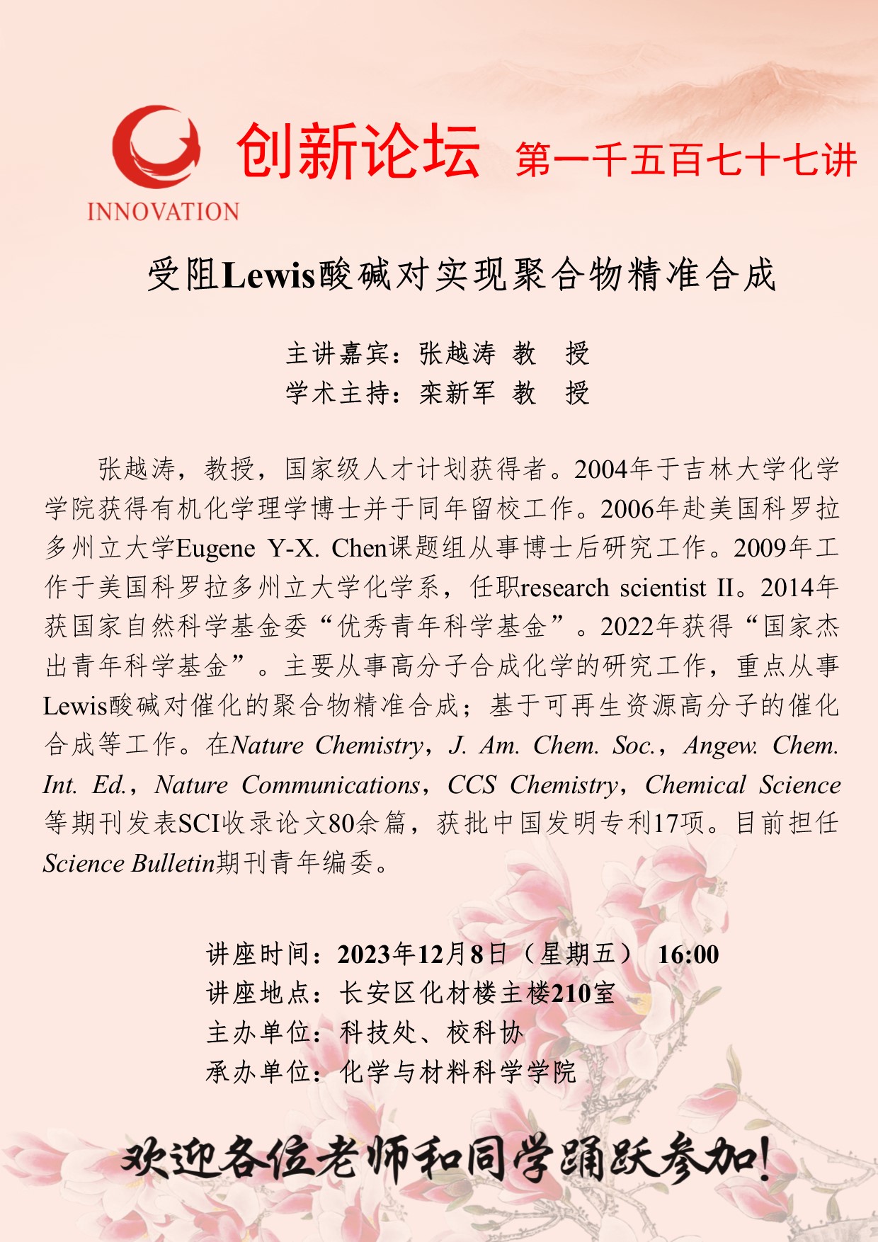 张越涛 教授 欧冠官方网站创新论坛第一千五百七十七讲:受阻Lewis酸碱对实现聚合物精准合成 讲座时间 2023年12月8日(星期五) 16:00 讲座地点 长安区化材楼主楼210室 讲座人介绍 张越涛 教授 讲座内容