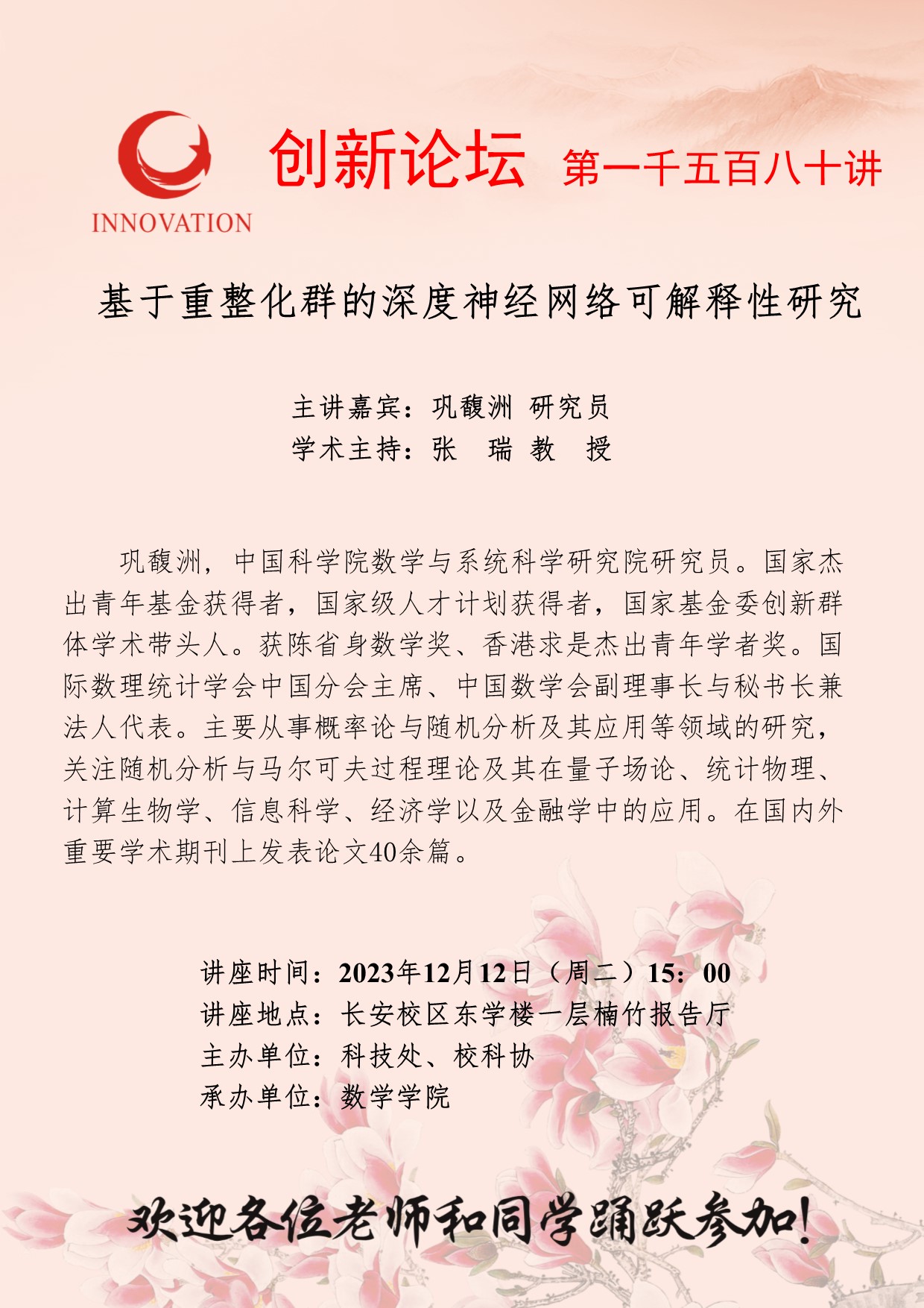 巩馥洲 研究员 欧冠官方网站创新论坛第一千五百八十讲:基于重整化群的深度神经网络可解释性研究 讲座时间 2023年12月12日(周二)15:00 讲座地点 长安校区东学楼一层楠竹报告厅 讲座人介绍 巩馥洲 研究员 讲座内容