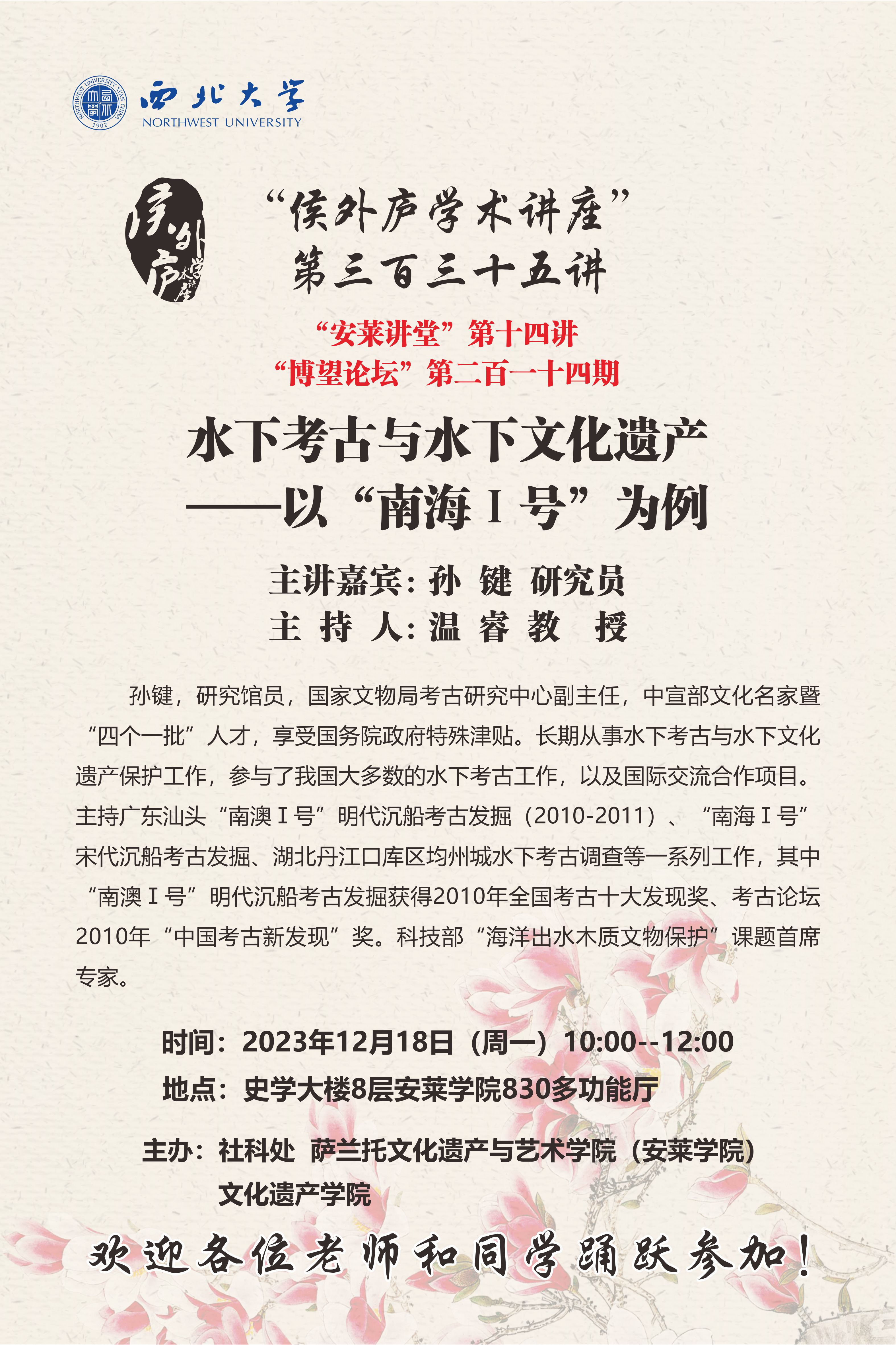 孙键 研究馆员 侯外庐学术讲座第三百三十五讲:水下考古与水下文化遗产---以“南海Ⅰ号”为例 讲座时间 2023年12月18日(周一)10:00 讲座地点 史学大楼8层安莱学院830多功能厅 讲座人介绍 孙键 研究馆员 讲座内容