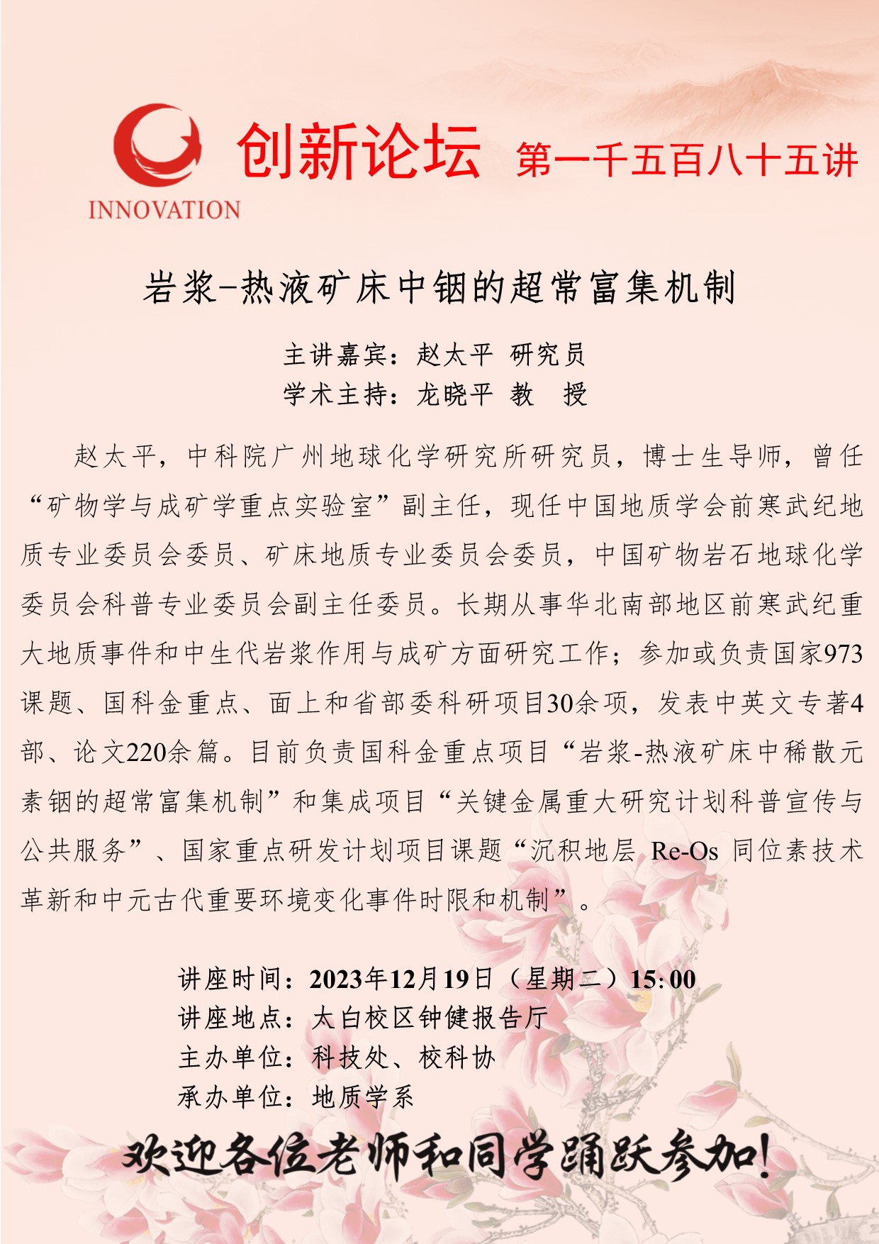 赵太平 研究员 欧冠官方网站创新论坛第一千五百八十五讲:岩浆-热液矿床中铟的超常富集机制 讲座时间 2023年12月19日(星期二)15:00 讲座地点 太白校区钟健报告厅 讲座人介绍 赵太平 研究员 讲座内容