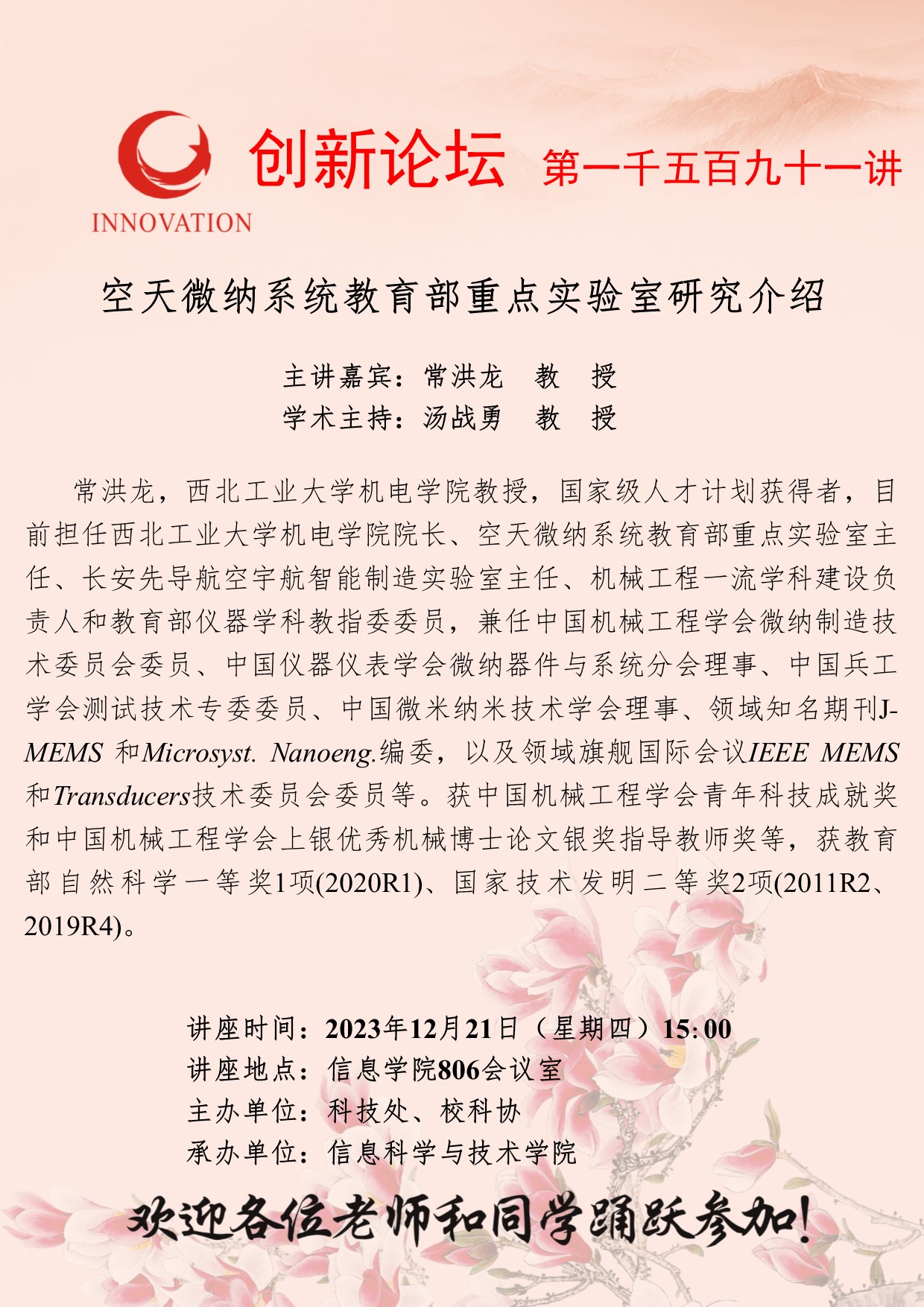 常洪龙 教授 欧冠官方网站创新论坛第一千五百九十一讲:空天微纳系统教育部重点实验室研究介绍 讲座时间 2023年12月21日(星期四)15:00 讲座地点 信息学院806会议室 讲座人介绍 常洪龙 教授 讲座内容