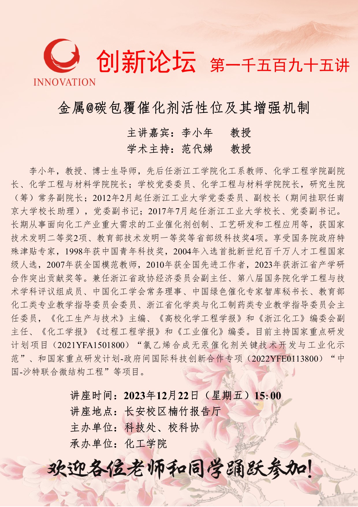 李小年 教授 欧冠官方网站创新论坛第一千五百九十五讲:金属@碳包覆催化剂活性位及其增强机制 讲座时间 2023年12月22日(星期五)15:00 讲座地点 长安校区楠竹报告厅 讲座人介绍 李小年 教授 讲座内容