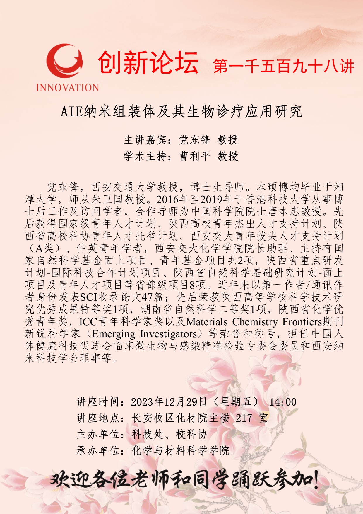 党东锋 教授 欧冠官方网站创新论坛第一千五百九十八讲:AIE纳米组装体及其生物诊疗应用研究 讲座时间 2023年12月29日(星期五) 14:00 讲座地点 长安校区化材院主楼217室 讲座人介绍 党东锋 教授 讲座内容